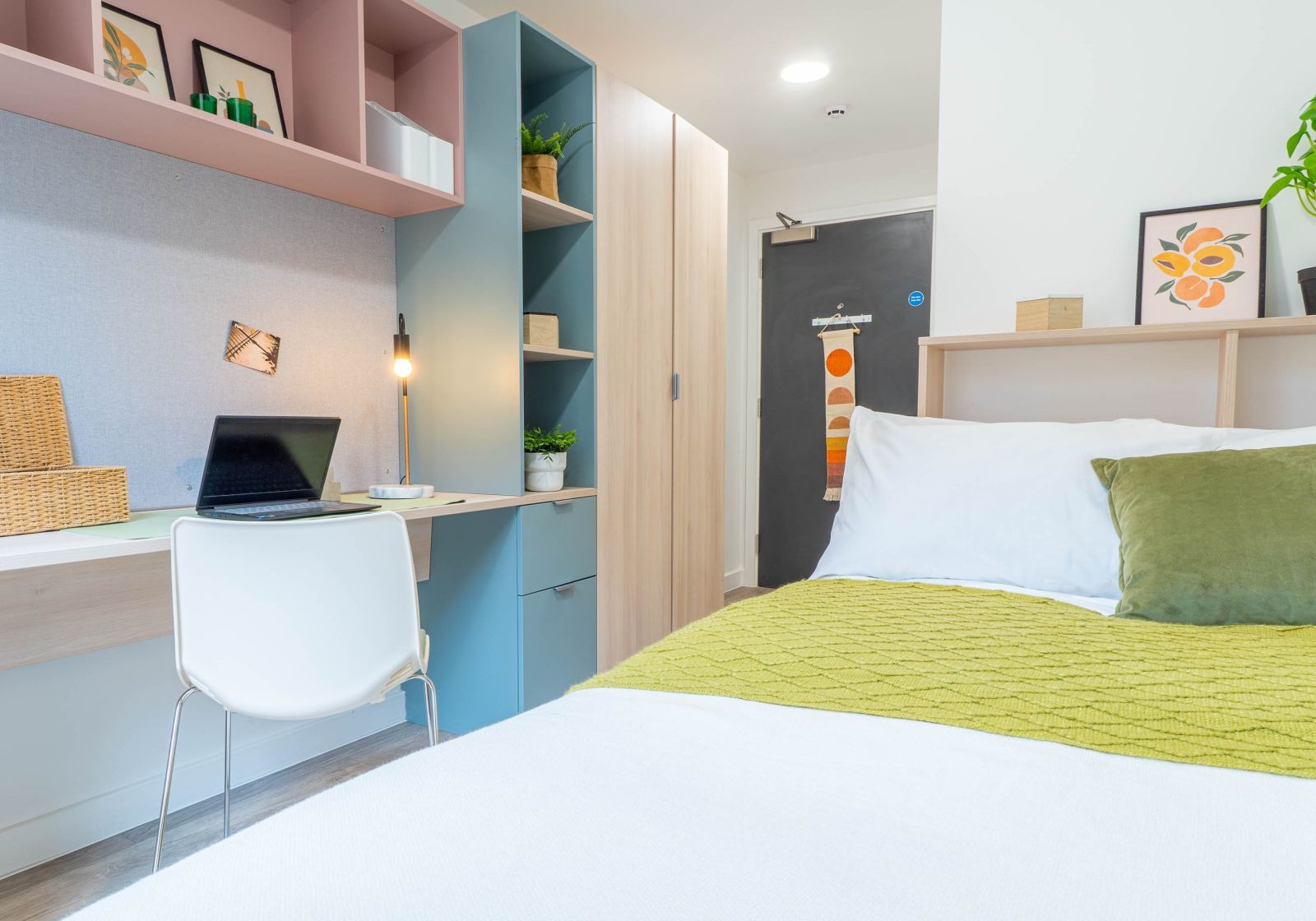 SIGN400-031125Enjoy a bright and modern bedroom with your own private bathroom - and the social buzz of a shared kitchen.\n\nYour room comes fully furnished with a bed, study desk and chair, plus your own private bathroom. With a roof terrace, fitness studio and cinema onsite, there's always something for you to keep busy with.\n\nYou're on track for your best year yet.