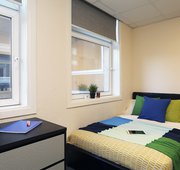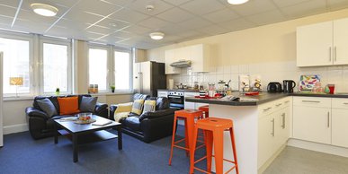 A large 15m2 Deluxe en-suite with ¾ sized bed, wardrobe, chest of drawers, mini fridge, safe and study desk. En-suite is fitted with a power shower. In clusters of 8 study rooms sharing a communal kitchen and living area.