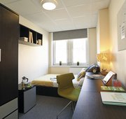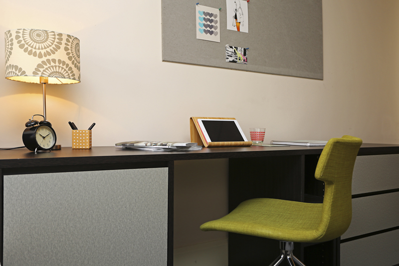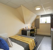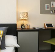 Classic en-suite with ¾ sized bed, wardrobe, chest of drawers, mini fridge, safe and study desk. En-suite is fitted with a power shower. In clusters of 8 study rooms sharing a communal kitchen and living area.
