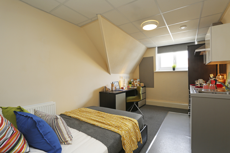 A modern Classic self-contained studio from 17m2. Fitted with a single bed, wardrobe, chest of drawers, study desk and kitchenette. The studio is fitted with a power shower.