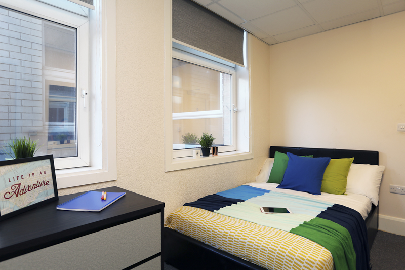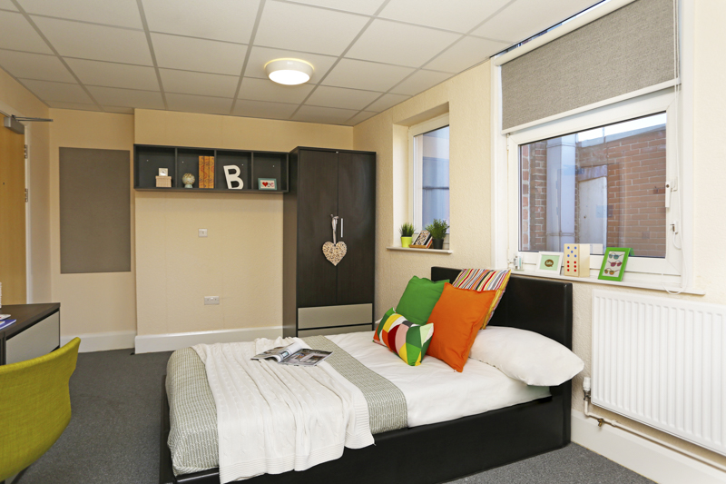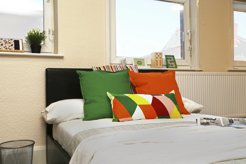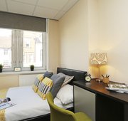A spacious 20m2 Premier room with ¾ sized bed, wardrobe, chest of drawers, mini fridge, safe and study desk. En-suite is fitted with a power shower. In clusters of 8 study rooms sharing a communal kitchen and living area.
