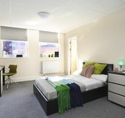 A modern Deluxe self-contained studio from 17 to 20m2. Fitted with double bed, wardrobe, chest of drawers, study desk and kitchenette. The studio is fitted with a power shower.