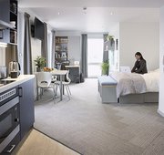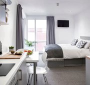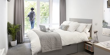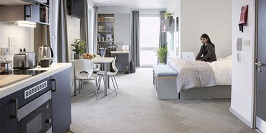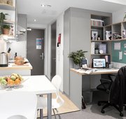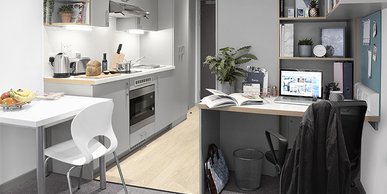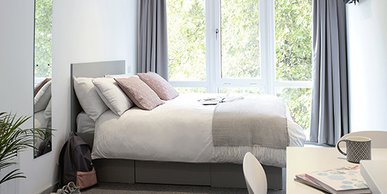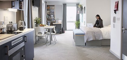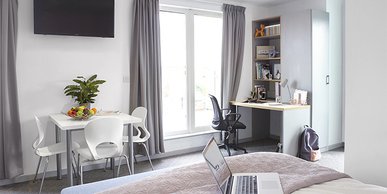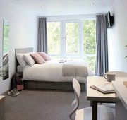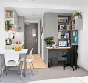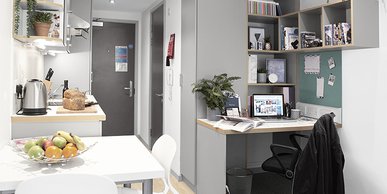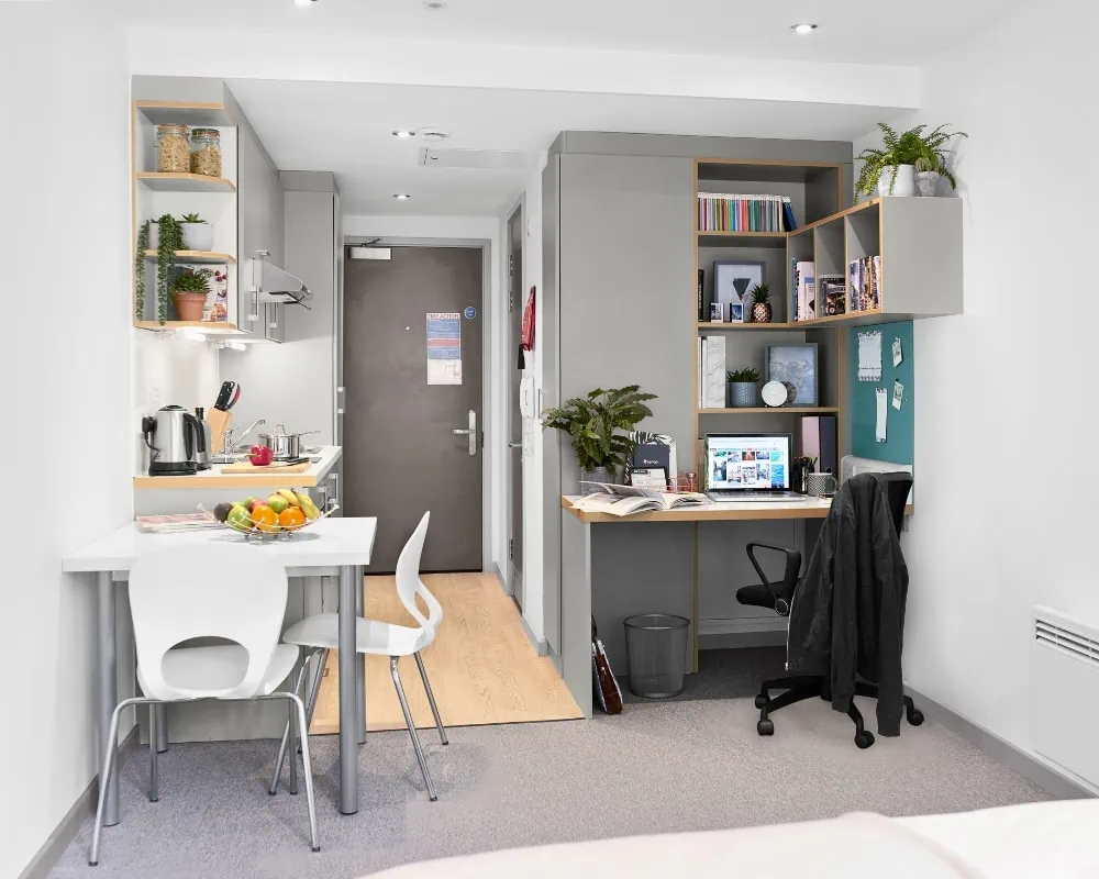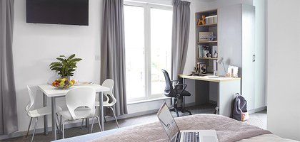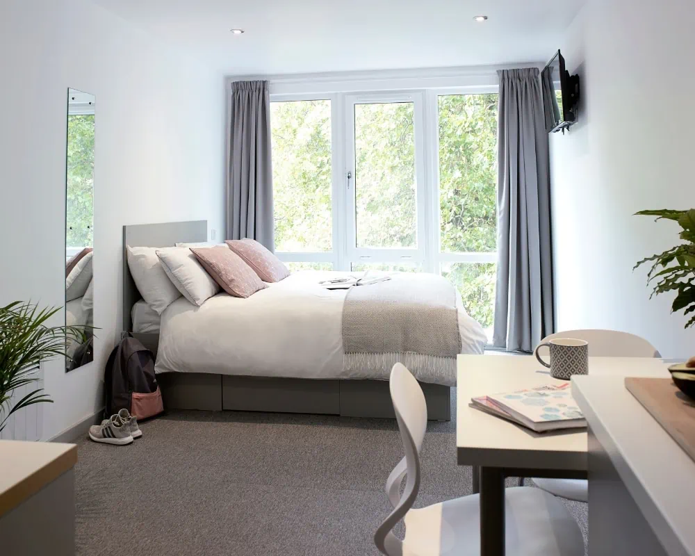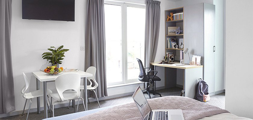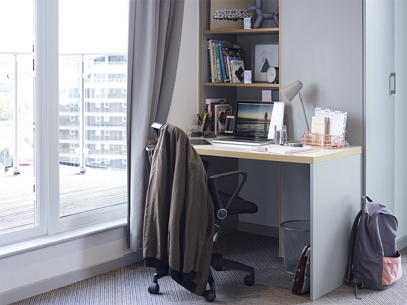 From 17m², Double Bed, Wardrobe, bedside table/shelf, drawers & underbed storage Dining table and chair(s) Large desk and chair, book shelves & noticeboard, Private balcony