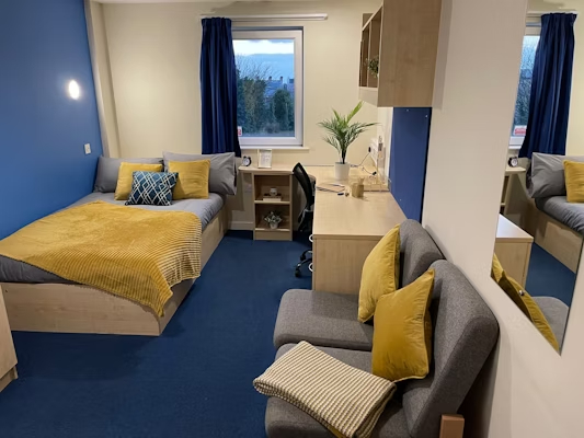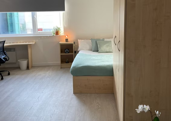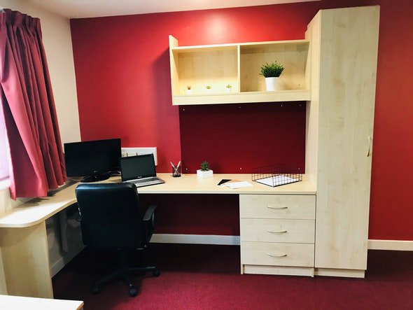 Communal kitchen, your own bathroom and living space shared with 3-5 students 15 – 19m2 approximately Double bed Ensuite bathroom with shower toilet and basin Under-bed storage, desk, chair, wardrobe and chest of drawers