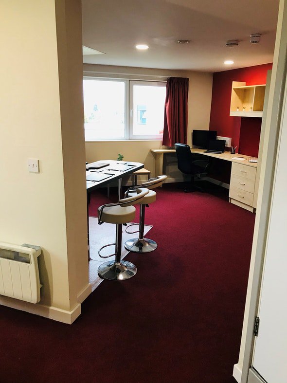 Self contained studio bedroom with own kitchen and bathroom 15-25m2 approximately Double bed Under-bed storage, desk, chair, wardrobe and chest of drawer