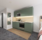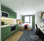 Studio size: 23–26m² | Accessible Option We have just one Gold Studio available on the ground floor – a spacious, accessible studio featuring an extra-large bathroom for added comfort and convenience. This premium studio is perfect for independent living, offering a double bed with under-bed storage, a generous ensuite bathroom with a shower, toilet, sink, towel rail, and mirrored cabinet, plus a full-size wardrobe, USB charging points, and a large desk with shelving – ideal for studying or relaxing in comfort. You’ll also enjoy your own fully equipped kitchenette, complete with a fridge/freezer, oven, microwave, and a free-to-use washer/dryer – everything you need, all in your own space.