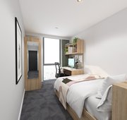 Room size: 14m² | Floors 4-5 Situated on the top floors, our high-floor Silver En suite rooms offer elevated views and a bright, welcoming atmosphere. South-facing rooms benefit from all-day sunlight – perfect for those who love natural light – while north-facing options provide a quieter, more shaded setting. Secure your preferred orientation early for the best experience. These rooms are part of 5–8 bedroom cluster apartments and are thoughtfully designed with student living in mind. Each includes a 3/4 double bed with under-bed storage, a private ensuite bathroom with a shower, toilet, sink, towel rail, and mirrored cabinet, as well as a full-size wardrobe, USB charging points, and a spacious desk with shelving – ideal for study and relaxation. The shared open-plan lounge and kitchen provide a sociable and comfortable space to unwind or cook with friends. Every apartment also includes a free-to-use washer/dryer, making laundry simple and hassle-free.