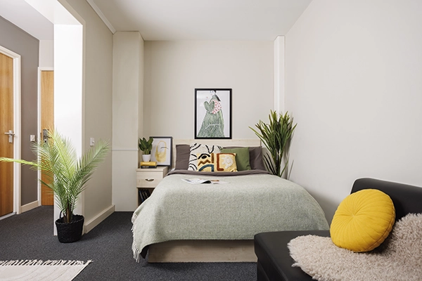Our premium studio offers luxury independent student living. Featuring a comfy double bed, personal kitchen and dining space and ensuite bathroom. Relax in your spacious double bed and enjoy the convenience of a private bathroom. Get social and use our common room, gym and other social spaces to strike the perfect balance.