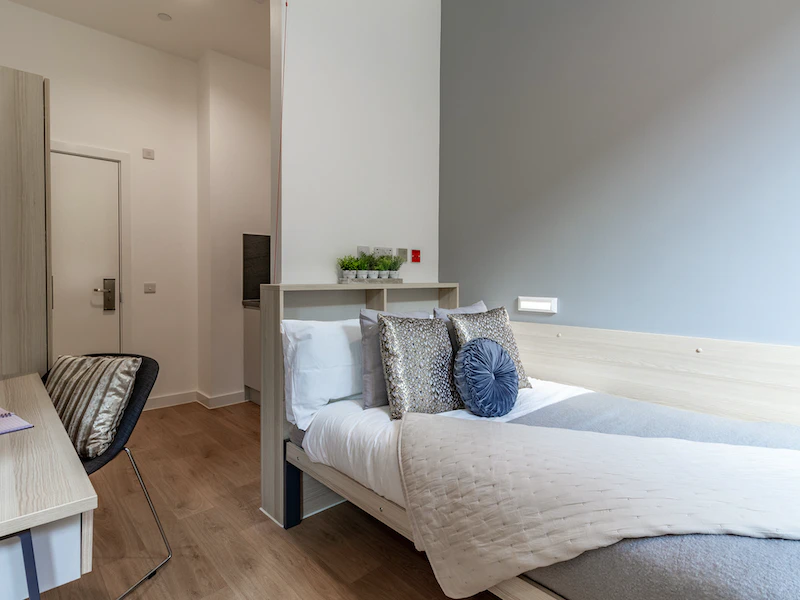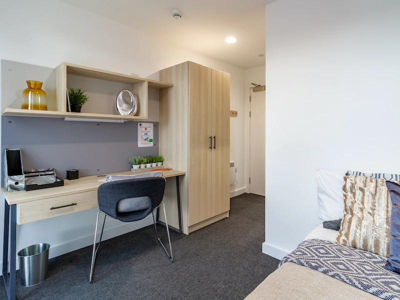This large studio room comes with a ¾ sized bed, study area, fully fitted kitchenette, ensuite bathroom and ample storage. You will have access to shared kitchen facilities and the amazing communal rooms.