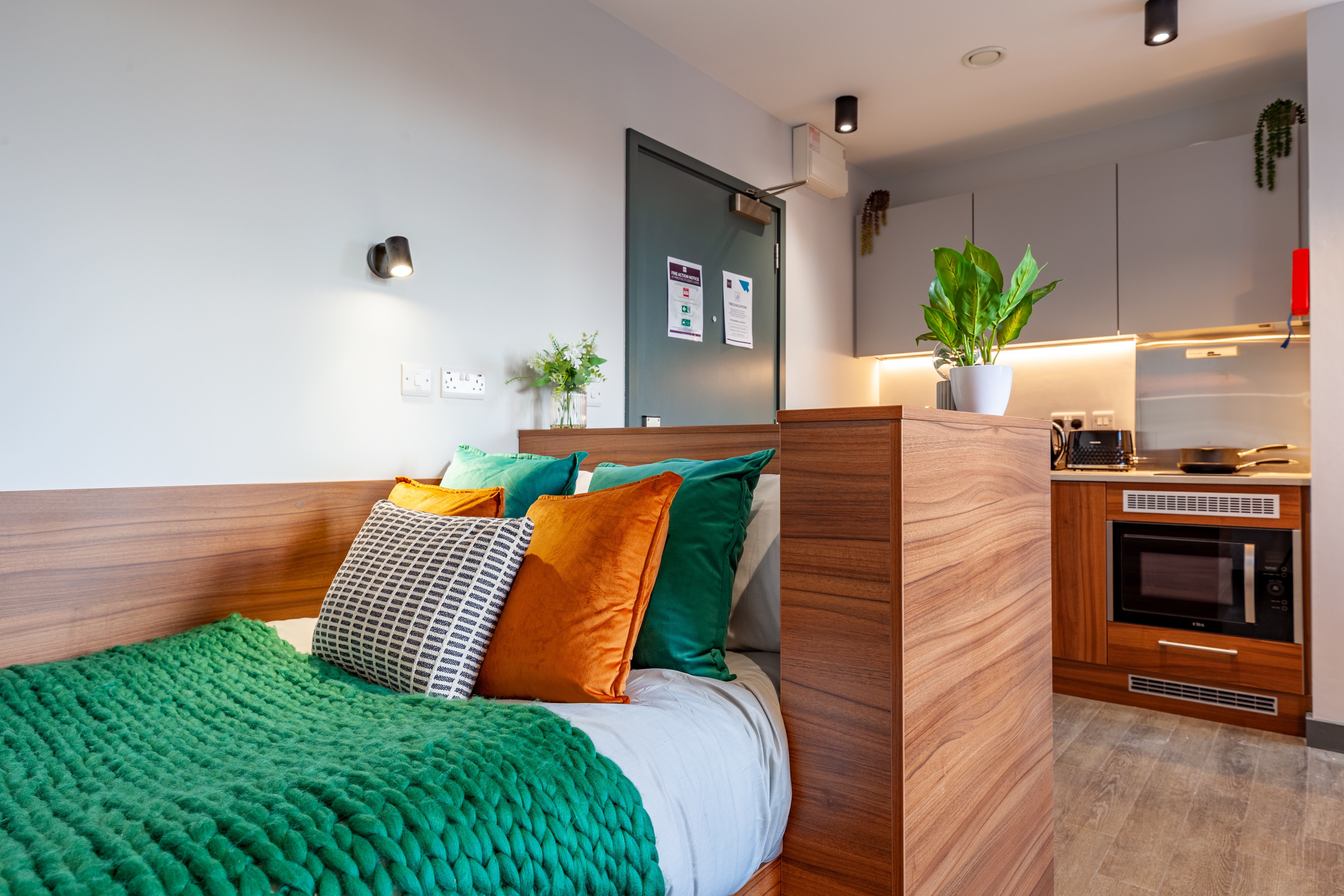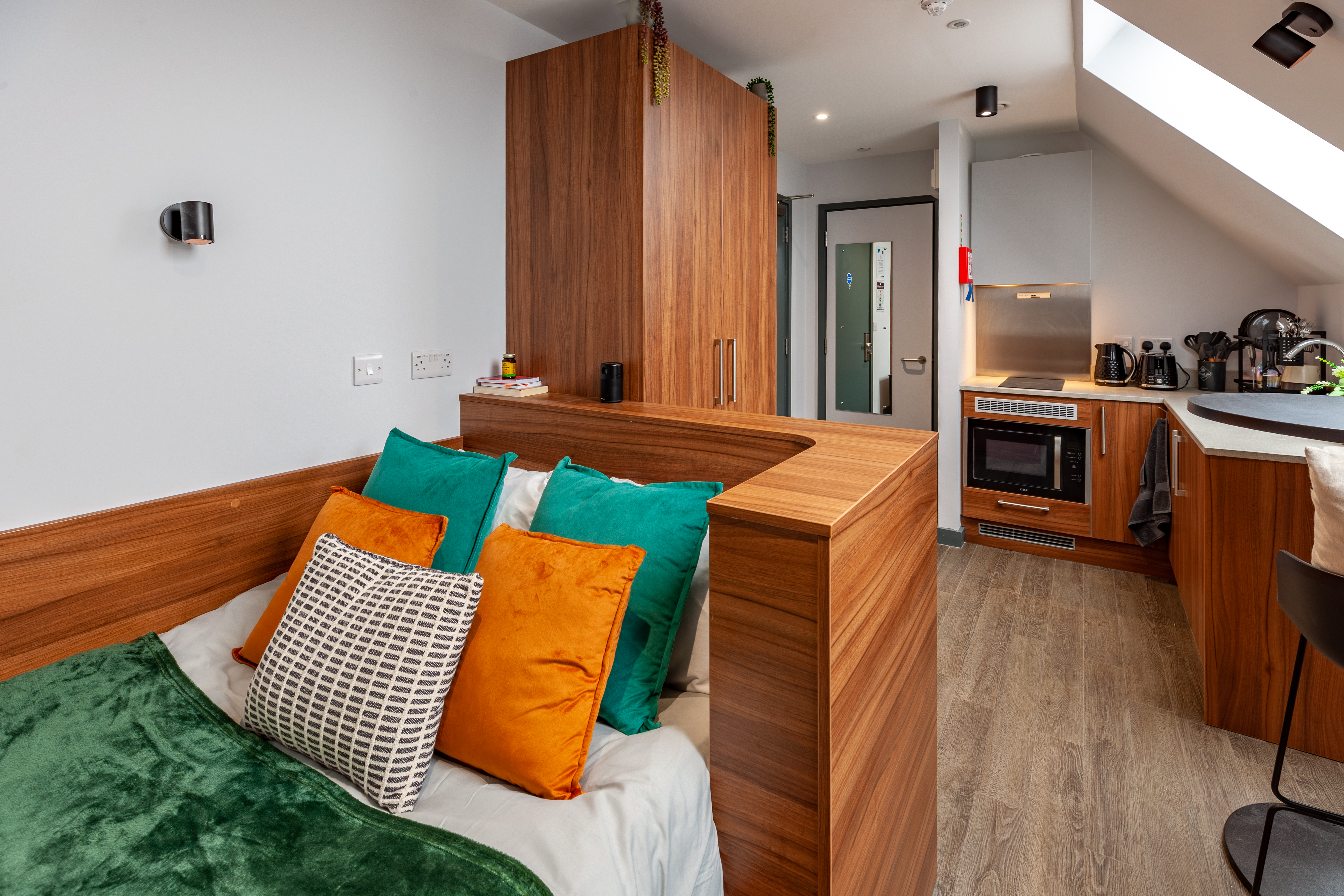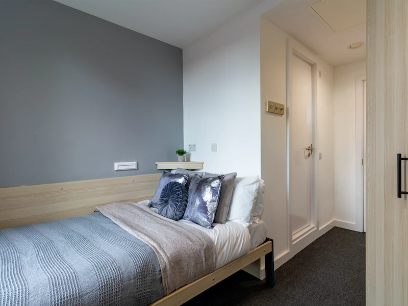 This accessible studio room comes with a ¾ sized bed, study area, fully fitted kitchenette, large ensuite bathroom and ample storage. You will have access to shared kitchen facilities and the amazing communal rooms.