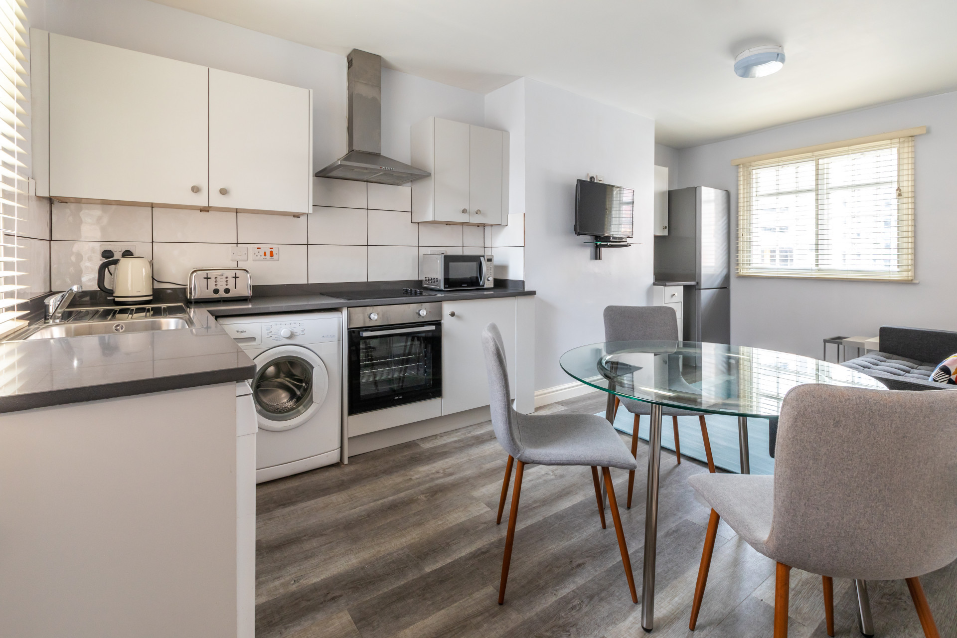 1. comes with brand new stylish furniture and black-out blinds. 2. comes with new bathrooms and a modern kitchen/living area