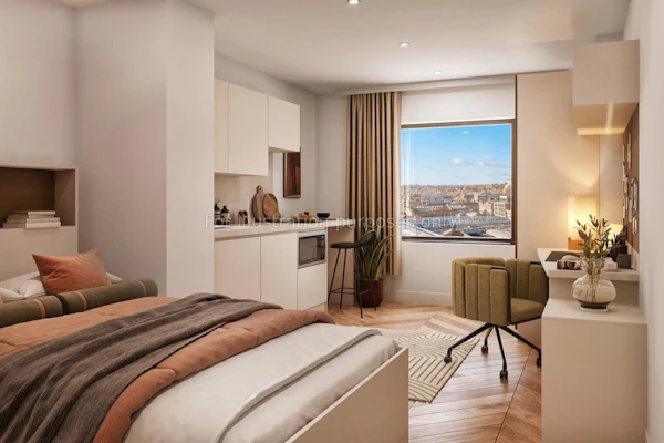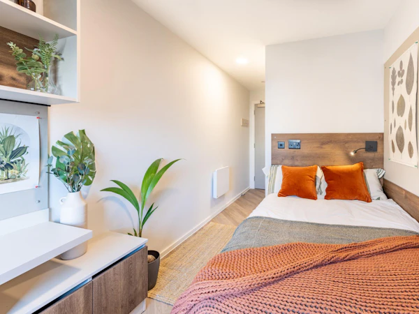 Experience Luxury Student Living in our Gold Studios, available on floors 6 to 10. These studios range from 20.1 to 20.2 square meters and come fully furnished. Each studio features a private washroom with storage, a small double bed with under-bed storage, a desk, a shelf above the desk, a wardrobe, a chair, a full-length mirror, black out curtains, and amenities like an oven, fridge freezer, hob and seated area so you can eat separately to studying! It’s an ideal space for students who want both functionality and style.