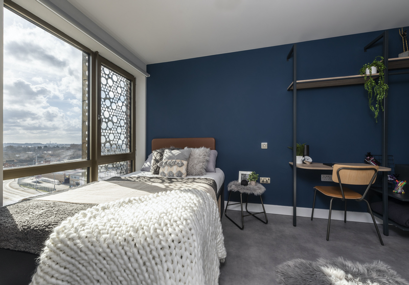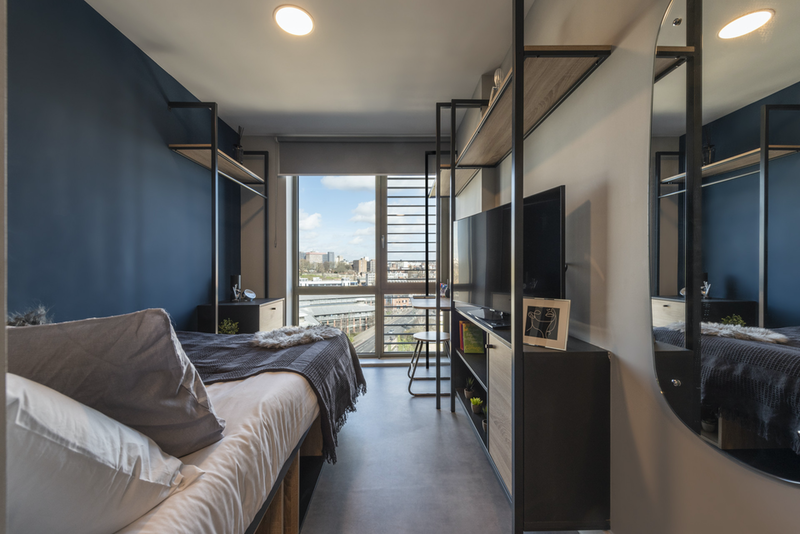 Situated on floors 8-11, our Skyline Ensuite is a great option for shared flats, with wonderful views from the top of the building. Our Skyline Ensuite rooms come between 12.3-13.2m². These offer your own private easy-to-clean shower room, convenient desk space, bookshelves, underbed storage, 4ft double bed and a shared kitchen with regular cleans included.
