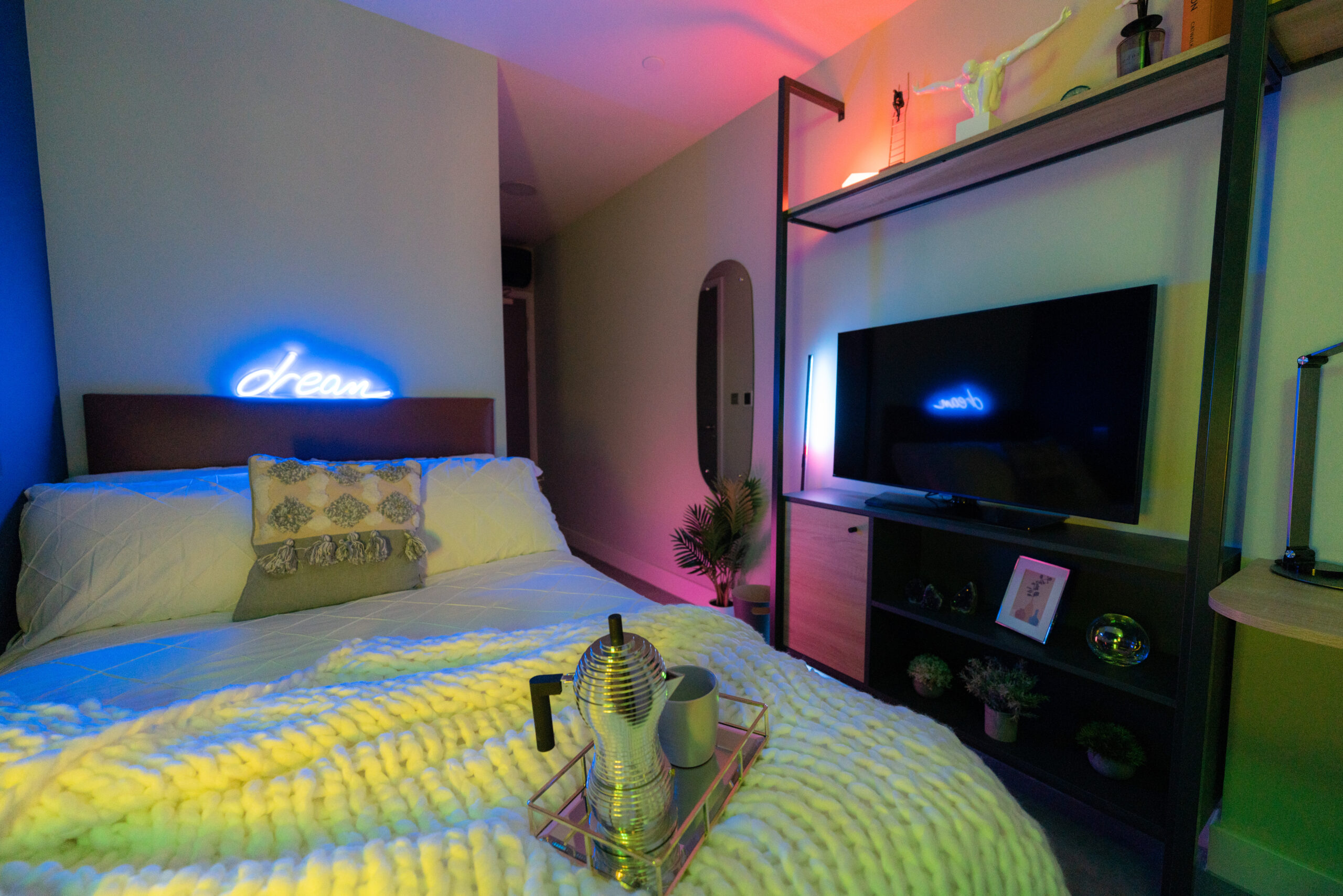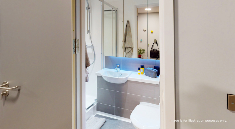 The perfect base for a great year at university, our Classic Ensuite has everything you need, covering the lower ground and ground floor for fantastic convenience. Classic Ensuites cover 12.1-13.6m² and come with your own private easy-to-clean shower room, convenient desk space, underbed storage, 4ft double bed and a shared kitchen with regular fortnightly cleans included. Best of all are the fast 250Mbps Wi-Fi or 1Gbps wired internet from the room’s ethernet port. We offer the essentials, upgraded, as standard. All rooms come with the latest tech, such as fast internet and a 43″ Samsung smart TV, with Chromecast to stream whatever you like from your laptop or phone- YouTube, Netflix or live sport, the choice is yours! You can ride out the next heat wave in comfort with aircon in every room.