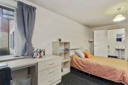Your room comes with a double bed, underbed storage, lots of space to chill out, an ensuite bathroom, a wardrobe, drawers, study desk and chair and a shelving unit for all your books.