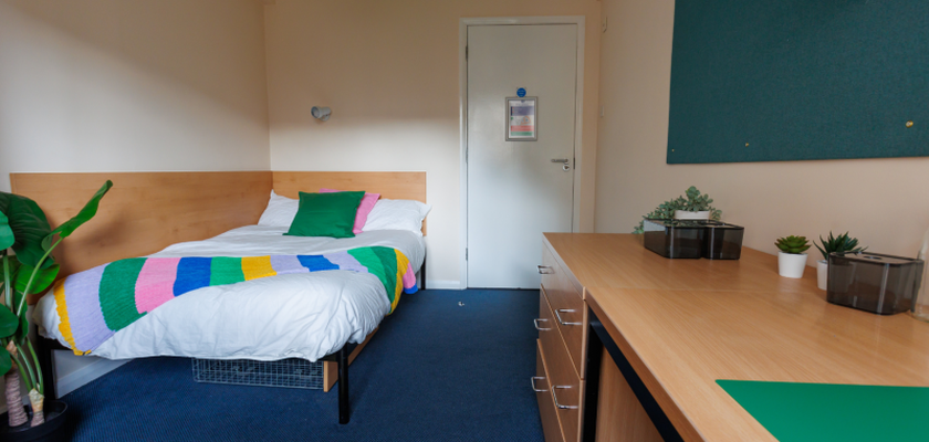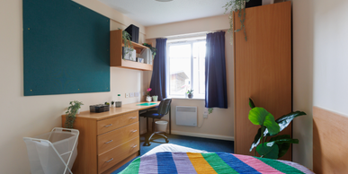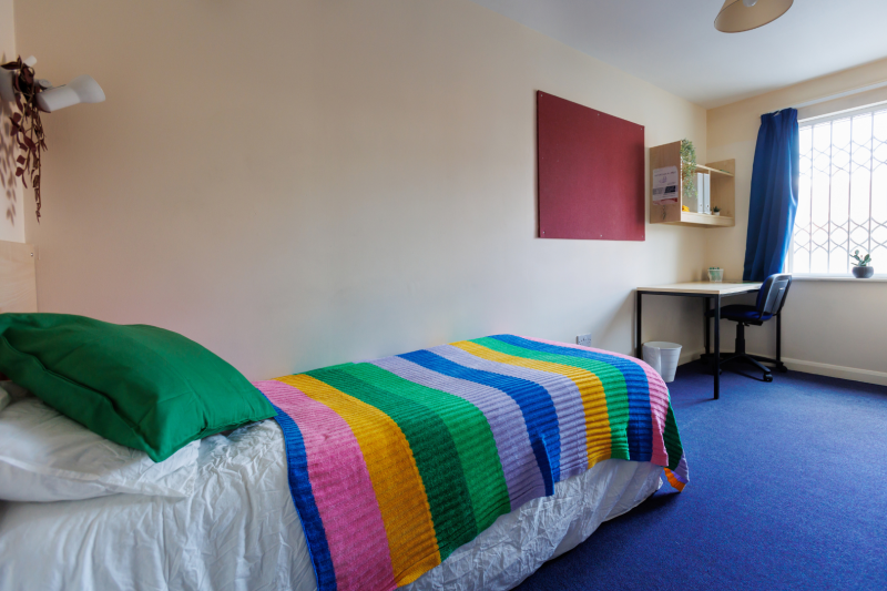 Your room comes with a three-quarter bed (which will fit a double bedding set just nicely) underbed storage, a wardrobe, drawers, study desk and chair and a shelving unit for all your books.