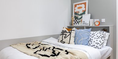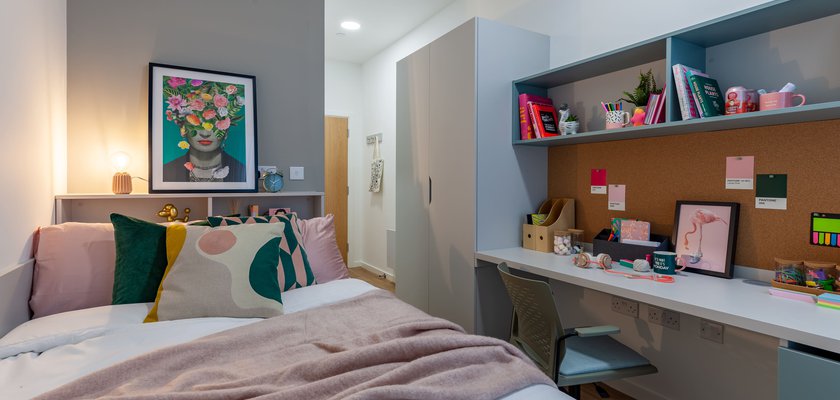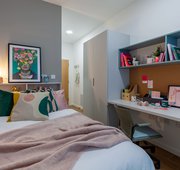 Situated on floors 5-7, 13-19m, this is a great value choice, with your own en-suite shower room, comfortable bed, study space, loads of storage and sociable living in the shared kitchen and lounge area. Accessible rooms are available for this room type.