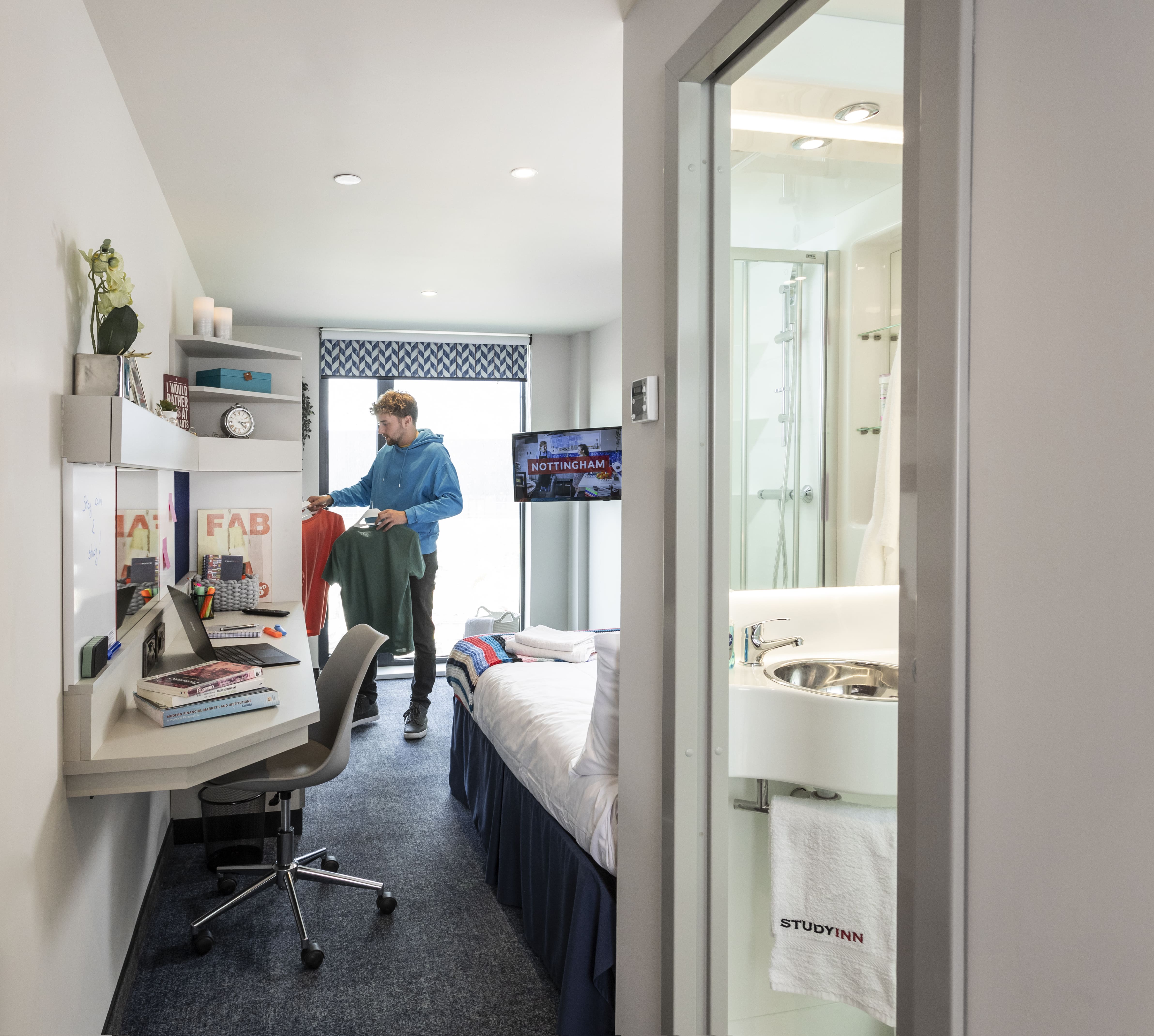 Platinum Plus studio rooms offer a fantastic design for student living that allows you to experience the full luxury of our student accommodation. Our Nottingham Platinum Plus studios offer the same features as the Platinum studios, with the added benefit of being located on the much south-after top floor of the building. Within a Platinum Plus room you will find a double wardrobe, spacious desk space, 32-inch flatscreen smart TV, kitchen and bedding essentials upon arrival, superfast Wi-Fi, and much more!