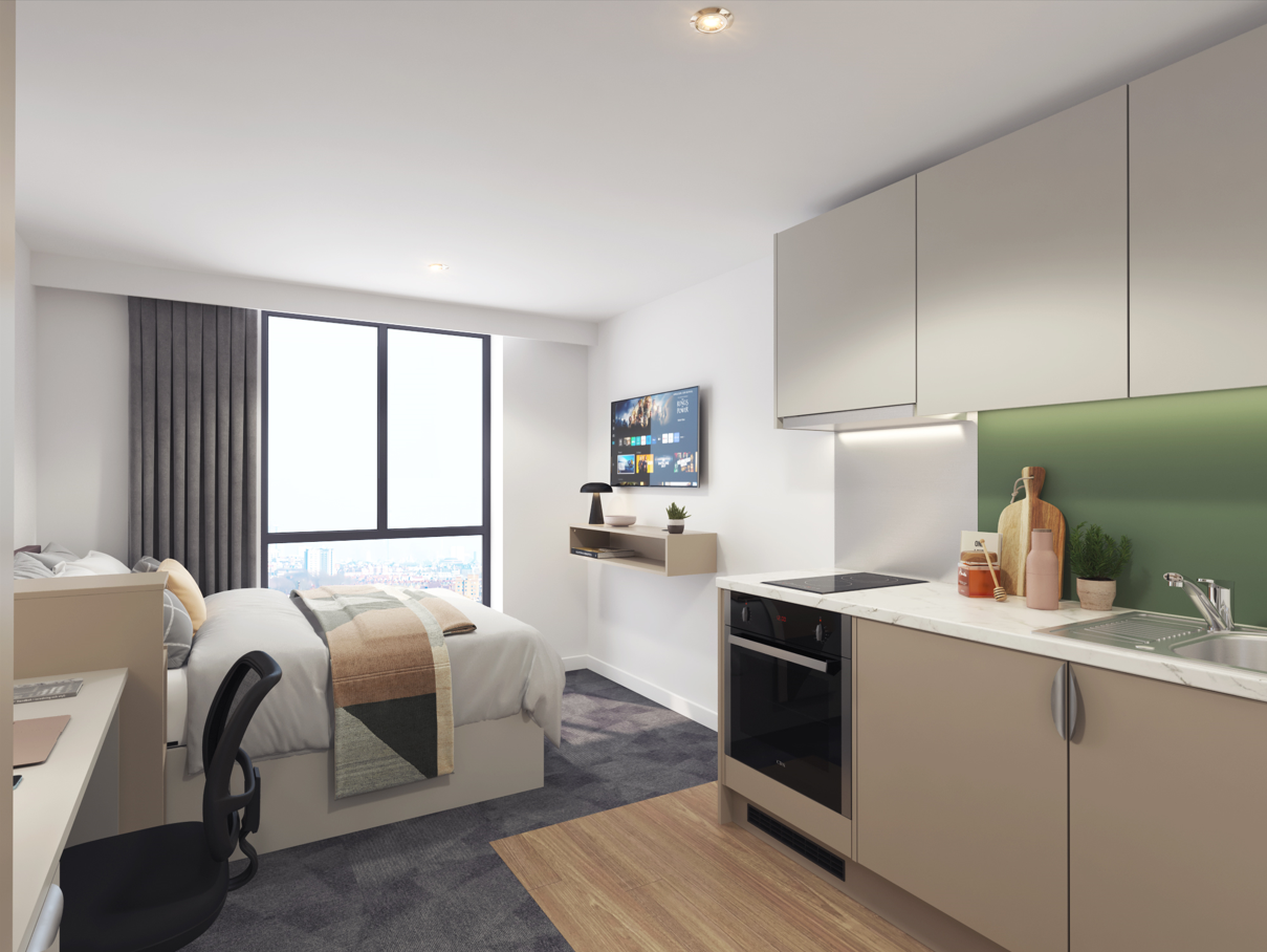 Our private student accommodation in Nottingham is perfect for making a home-away-from-home when moving to university! These studio rooms come fully equipped with a double bed, desk area, en-suite bathroom, and your very own private, fully-fitted kitchenette. Our true studios are 18-20.4 sqm in size.