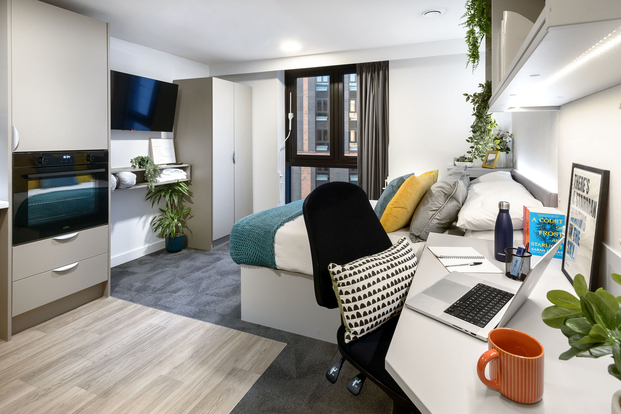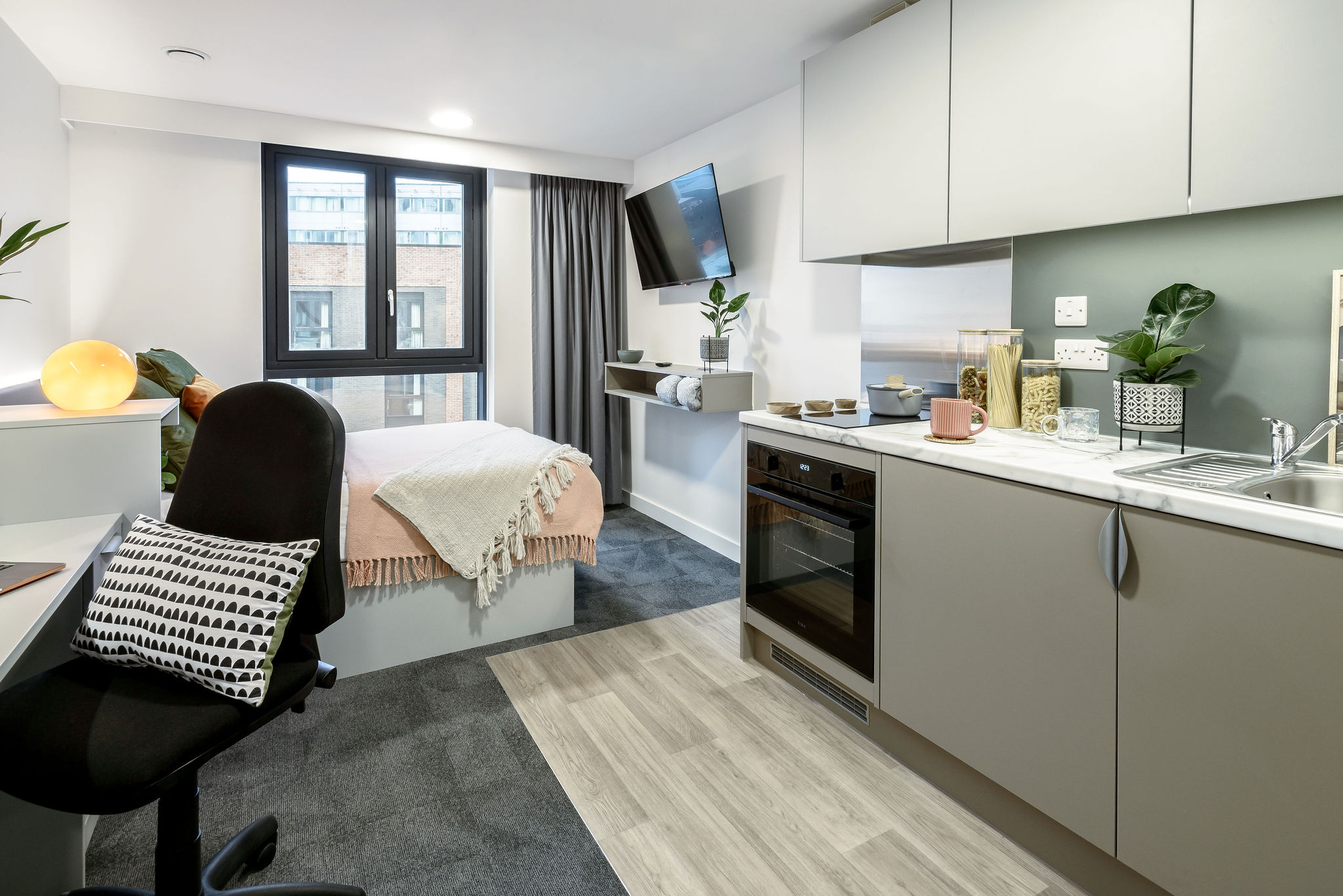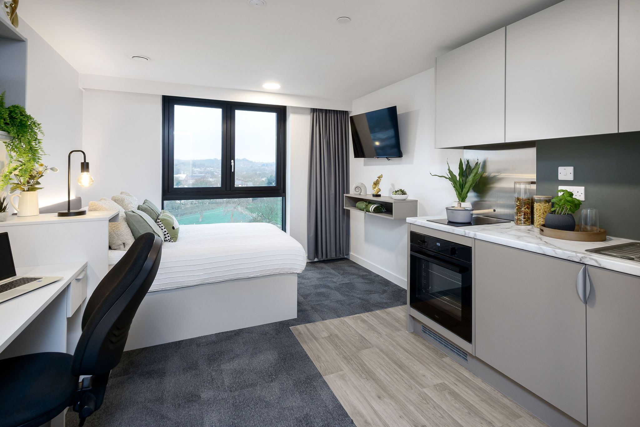Other rooms include self-contained studios featuring a double bed, quality mattress, desk, and chair, smart TV, full-length mirror, private en-suite bathroom, and fully fitted kitchenette in addition to a studio room designed with accessibility in mind.