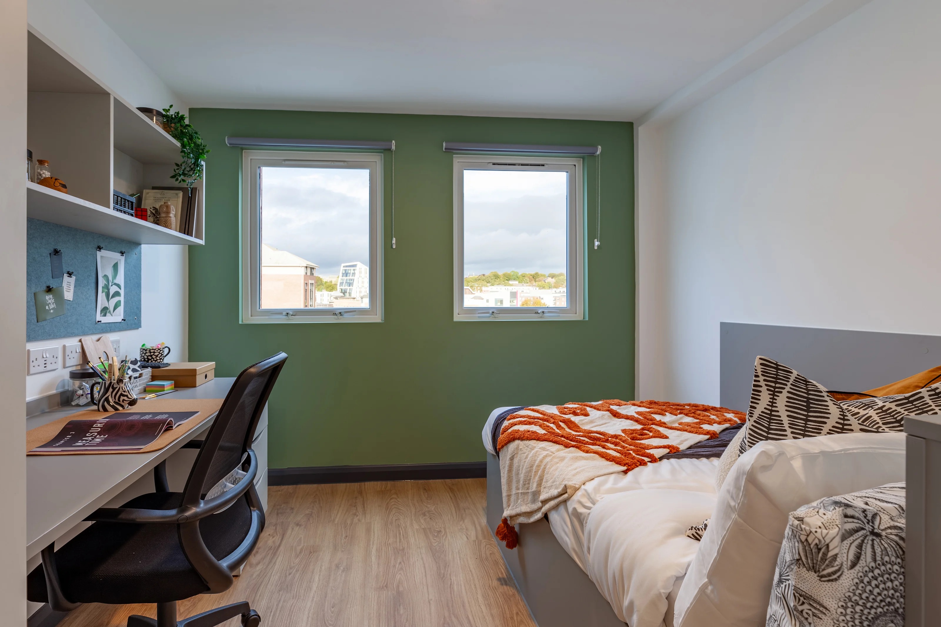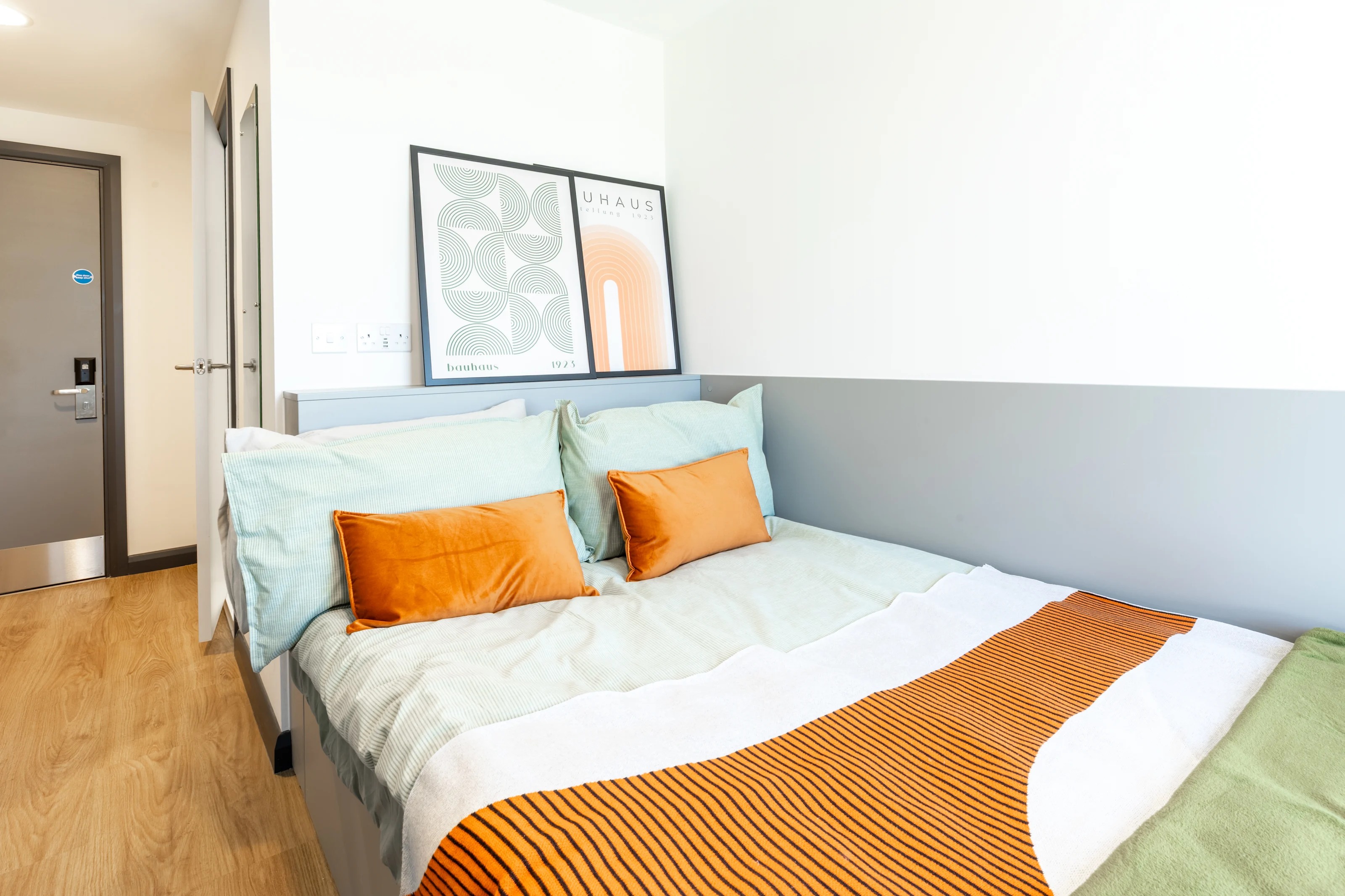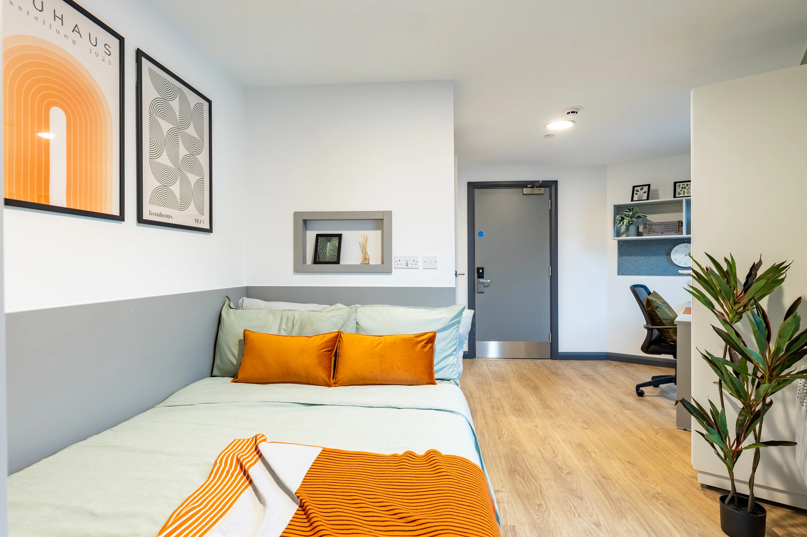 Our Bronze en suites are situated between the ground and 11th floor. Each en suite is furnished with a comfortable small double bed, ample storage, generous workspace, and a private en suite shower. Additionally, youll enjoy access to a communal kitchen and living area. These rooms are bigger than our standard bronze en suite.