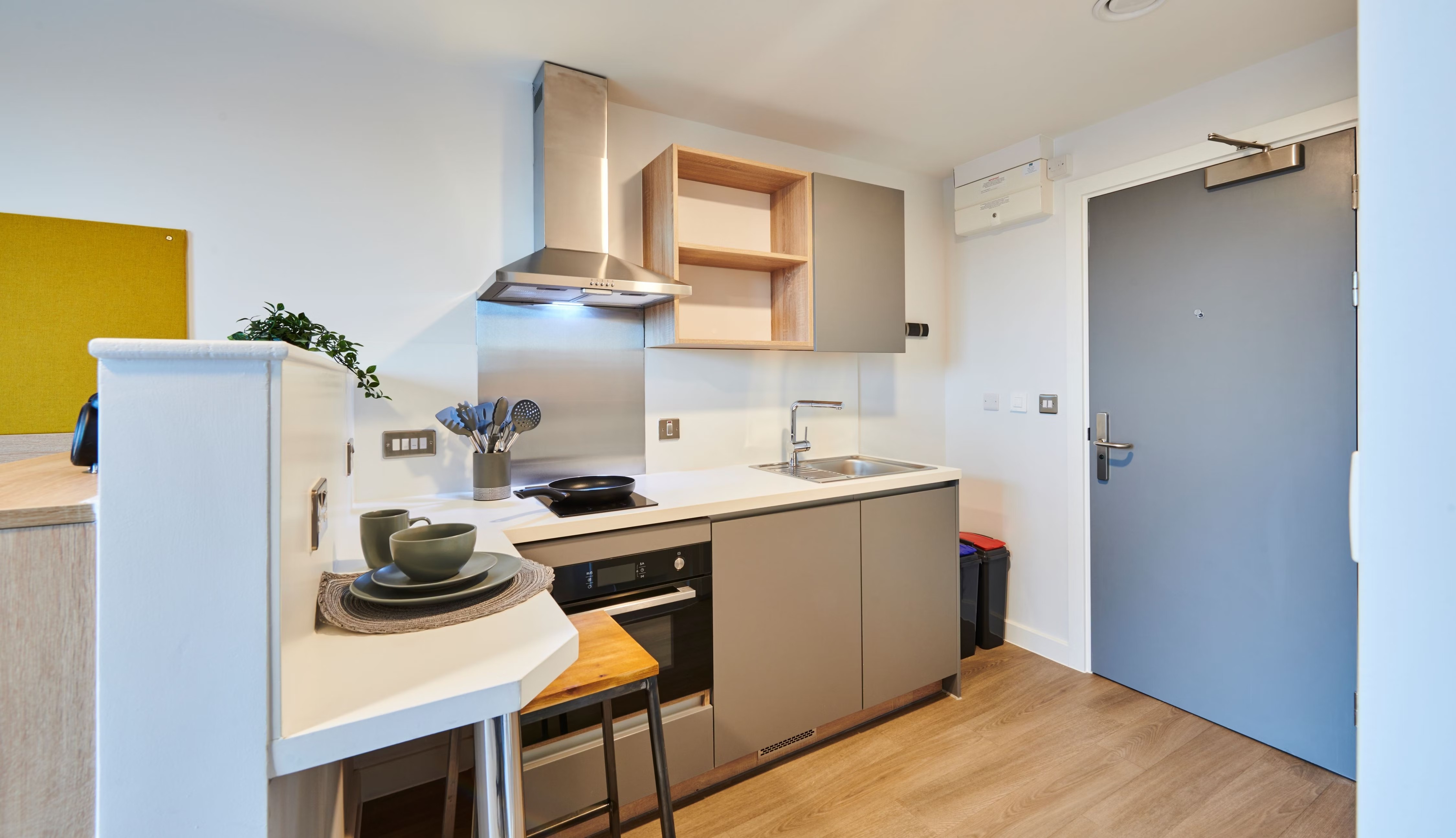 Self contained studio bedroom with own kitchen and bathrooms Small double bed Under-bed storage, desk, chair, wardrobe and chest of drawers