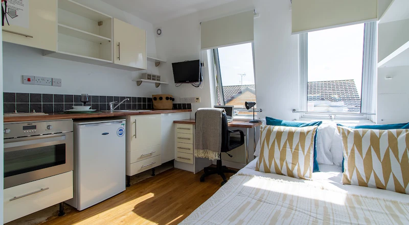 Our studios offer you privacy of your own. An en suite bathroom and kitchenette while you study and has a big comfy bed, TV, a study area, and plenty of storage space for all your bits and bobs.