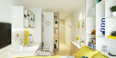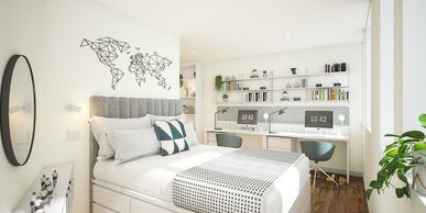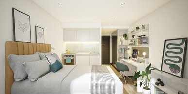 Our studios are all contemporary in design and include the latest technology. They each come with their own en-suite bathroom, private kitchen area and plenty of space for you to study or relax. 34.4m2 average size