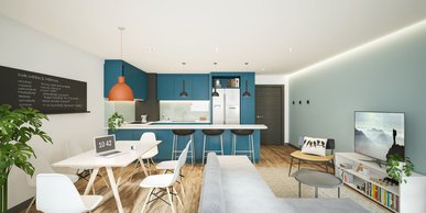 Our flats come with summer air-conditioning, private en-suite bathrooms, a shared kitchen/living area and plenty of space for you to study or relax.