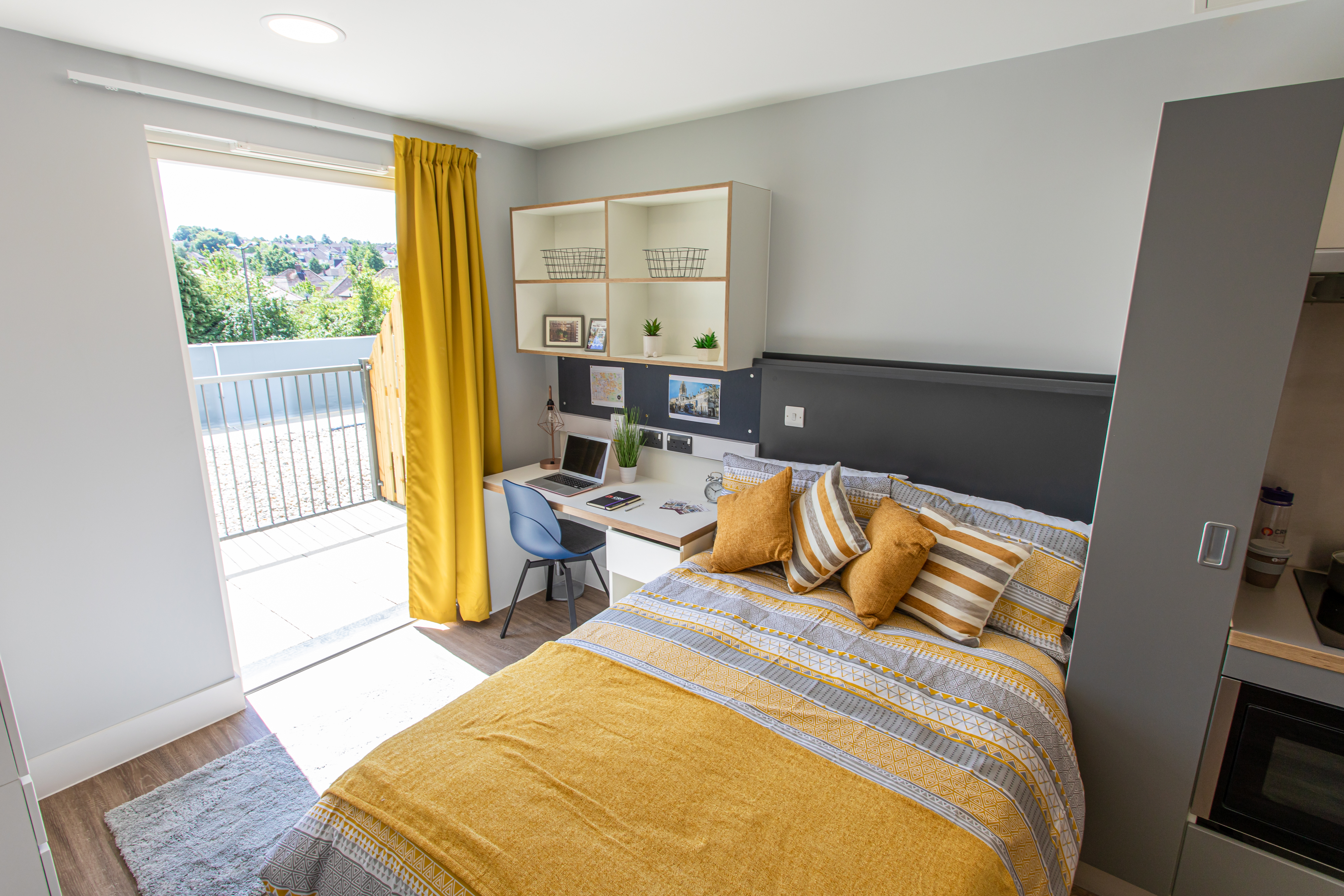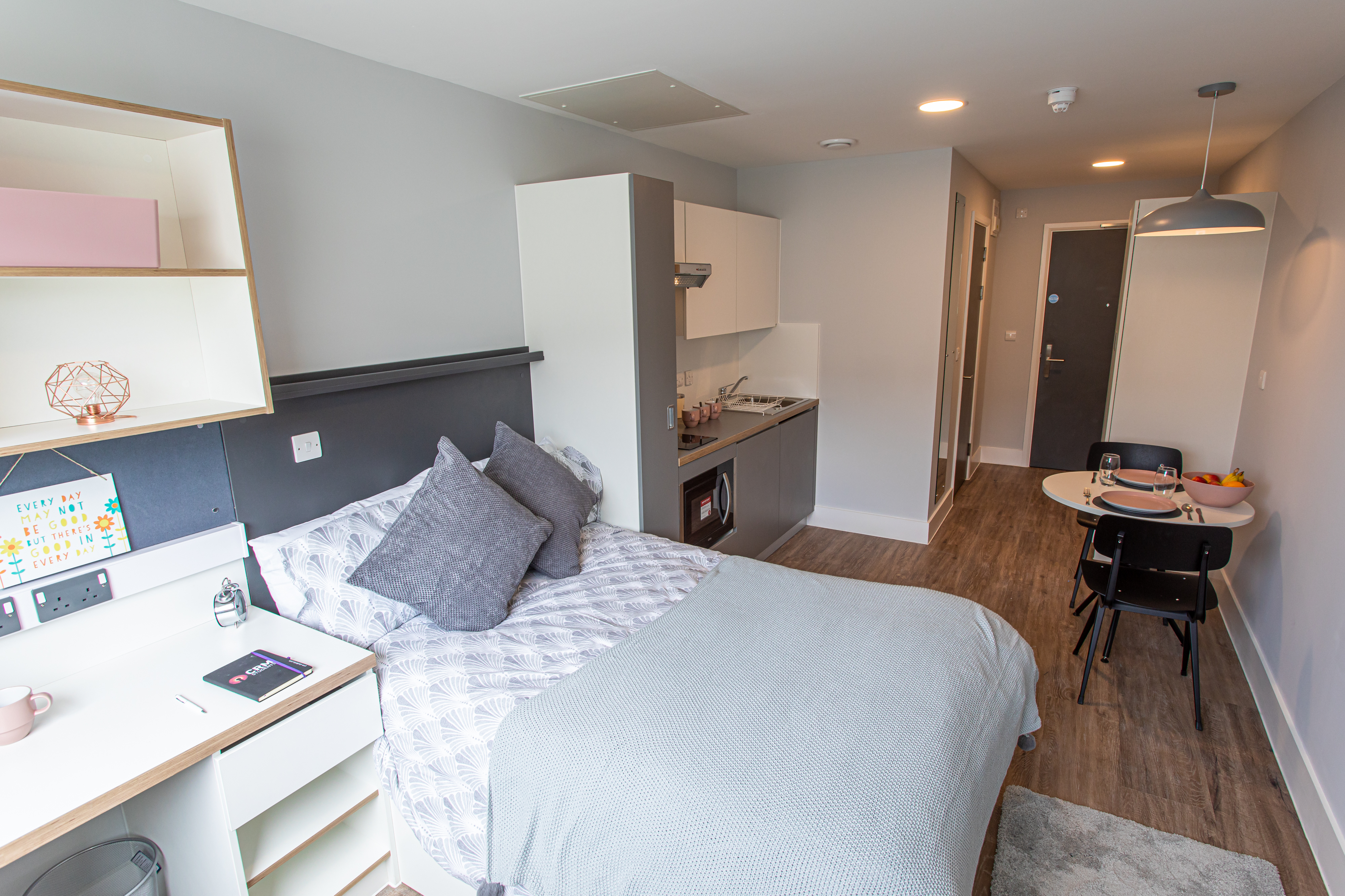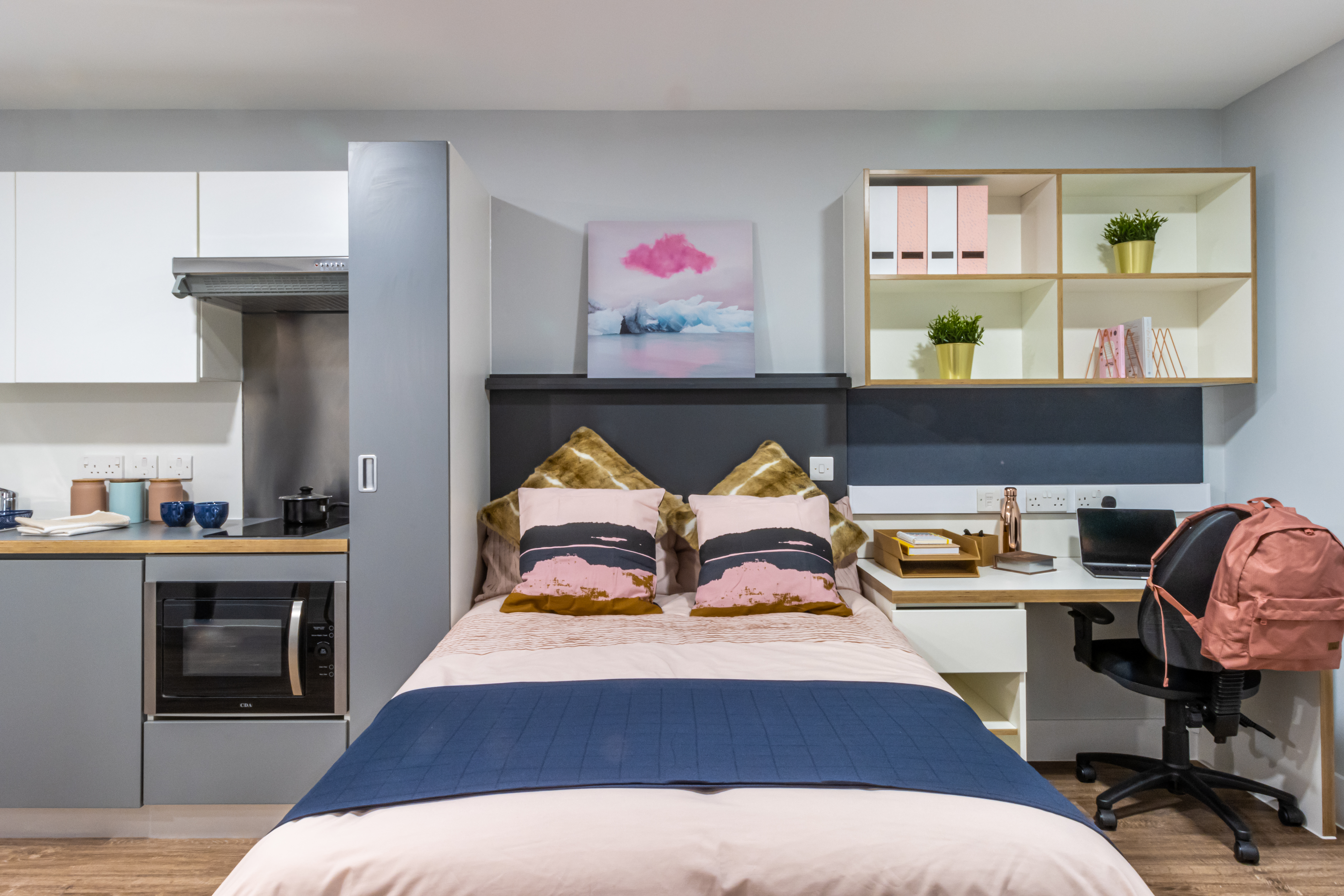 Room sizes may vary from 20.8m2 to 21.6m2 Your own private terrace 2 ring ceramic hob Combination oven, microwave & grill Sink Fridge/freezer En-suite Breakfast bar and stool Table and desk chair 3/4 bed with under bed storage Wall mounted shelves Pedestal Wardrobe Pinboard Coat hooks Mirror Bedside table