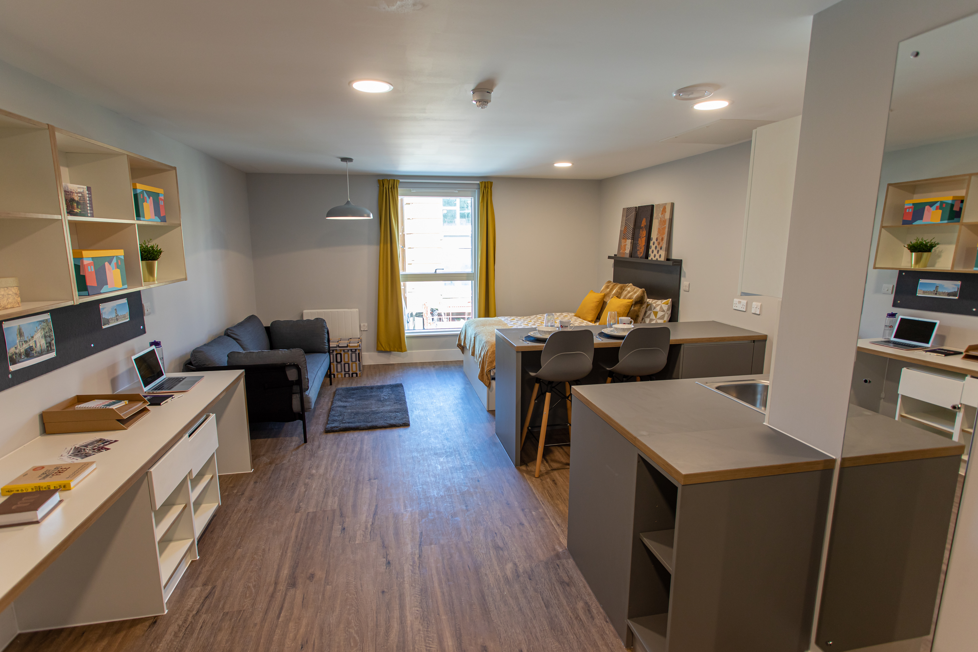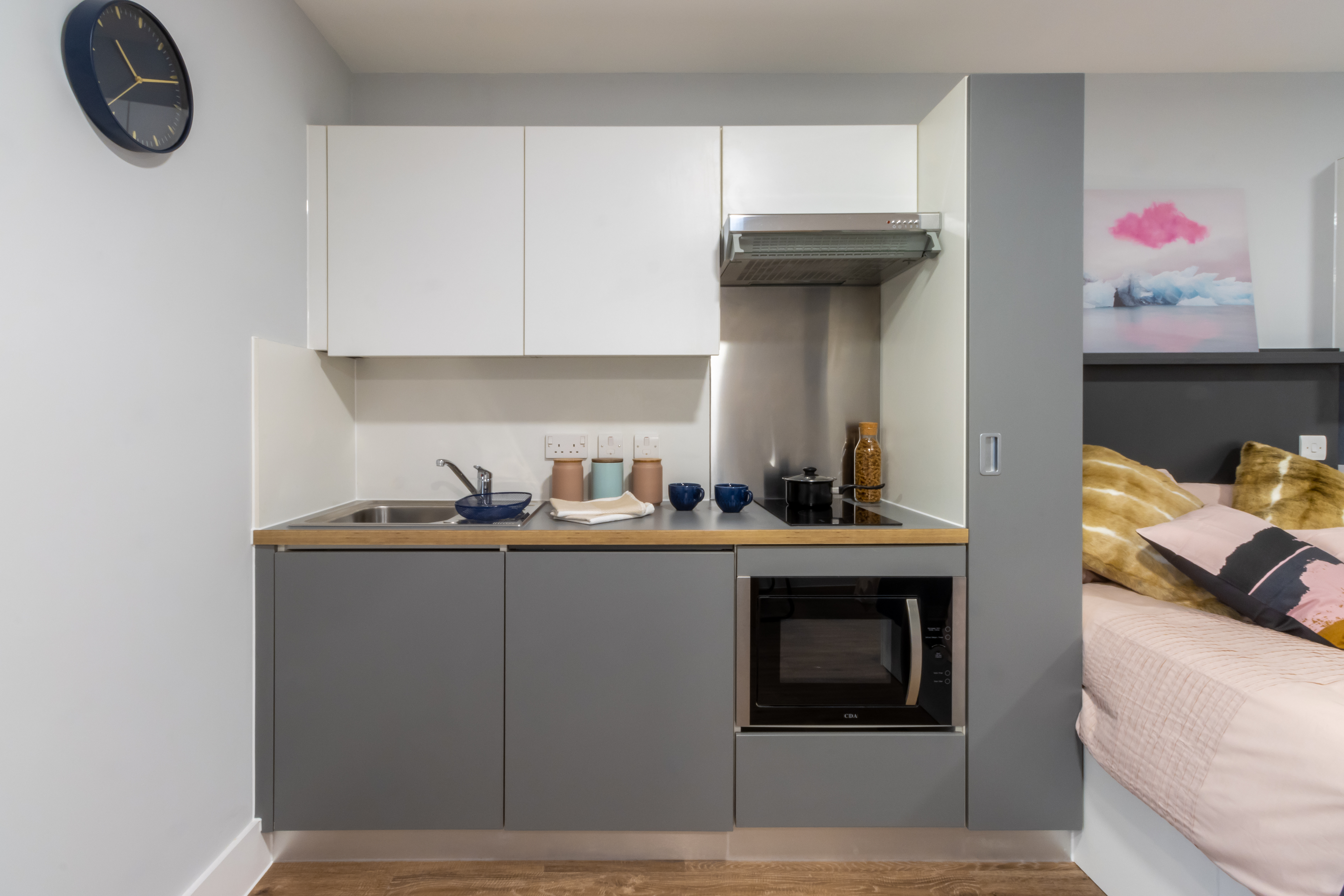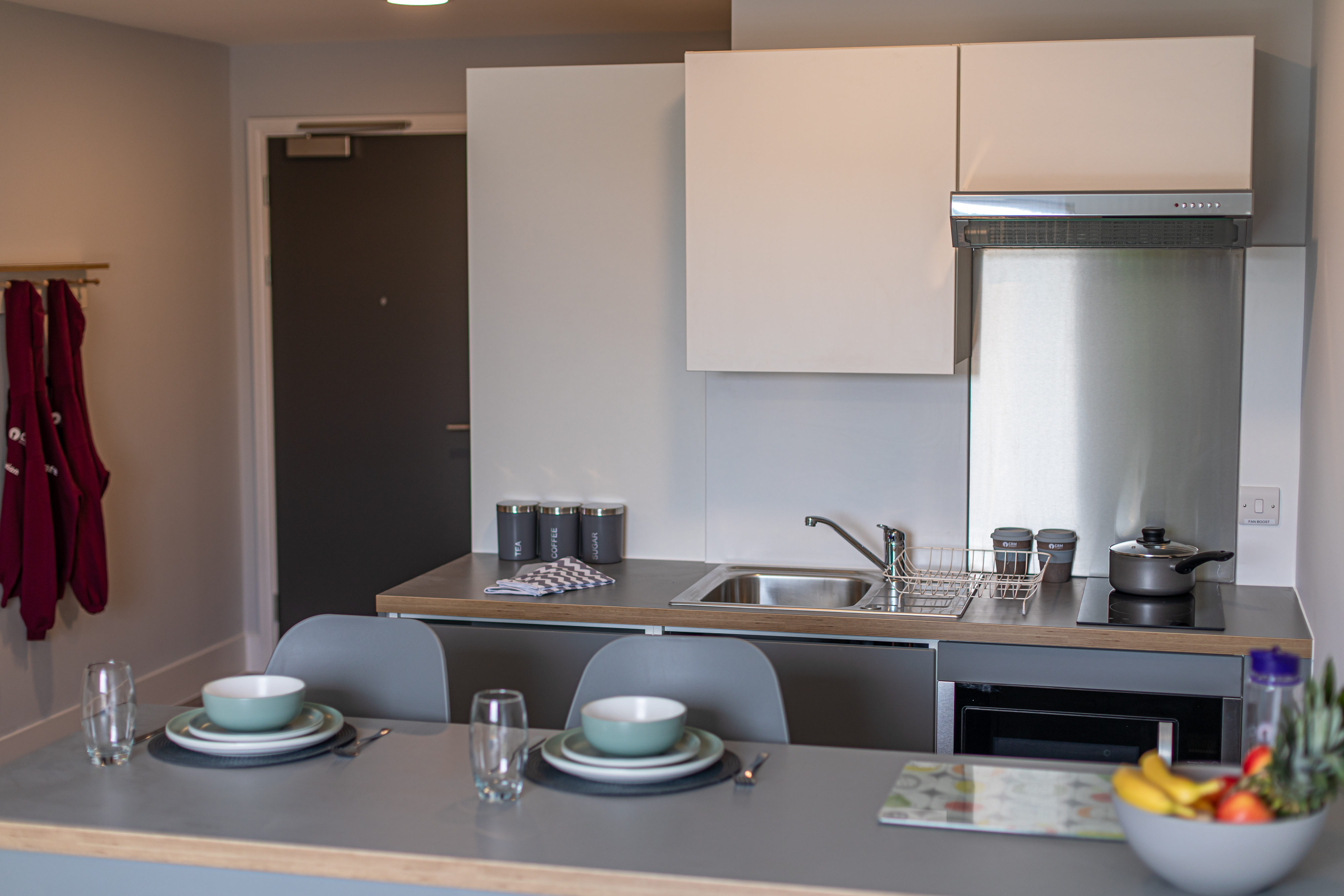 Room sizes may vary from 20.8m2 to 21.6m2 Your own private terrace 2 ring ceramic hob Combination oven, microwave & grill Sink Fridge/freezer En-suite Breakfast bar and stool Table and desk chair 3/4 bed with under bed storage Wall mounted shelves Pedestal Wardrobe Pinboard Coat hooks Mirror Bedside table