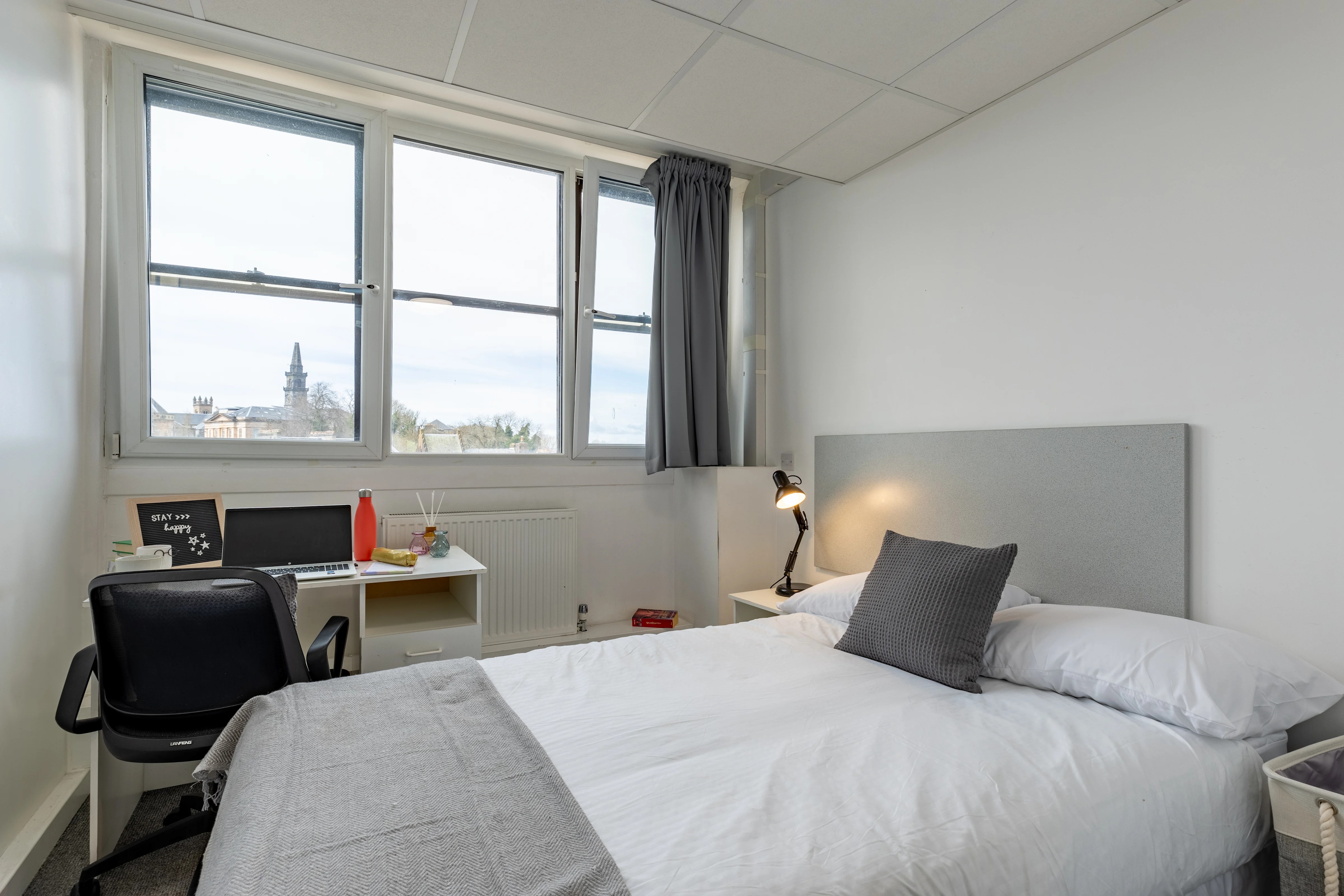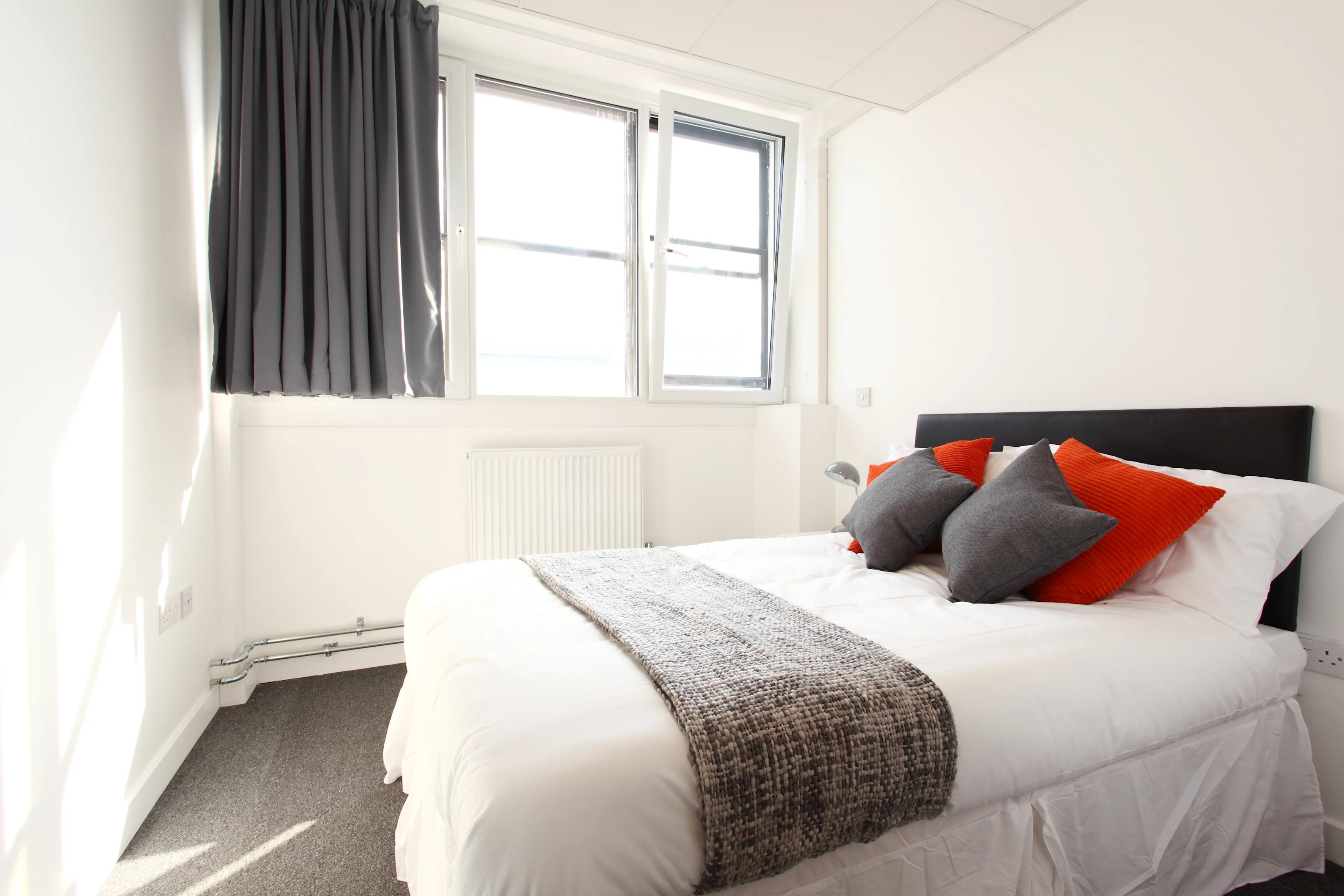 Standard en-suite room with modern furniture and access to a shared kitchen, located on the 1st and 3rd floors. These rooms have recently been refurbished and modernised.