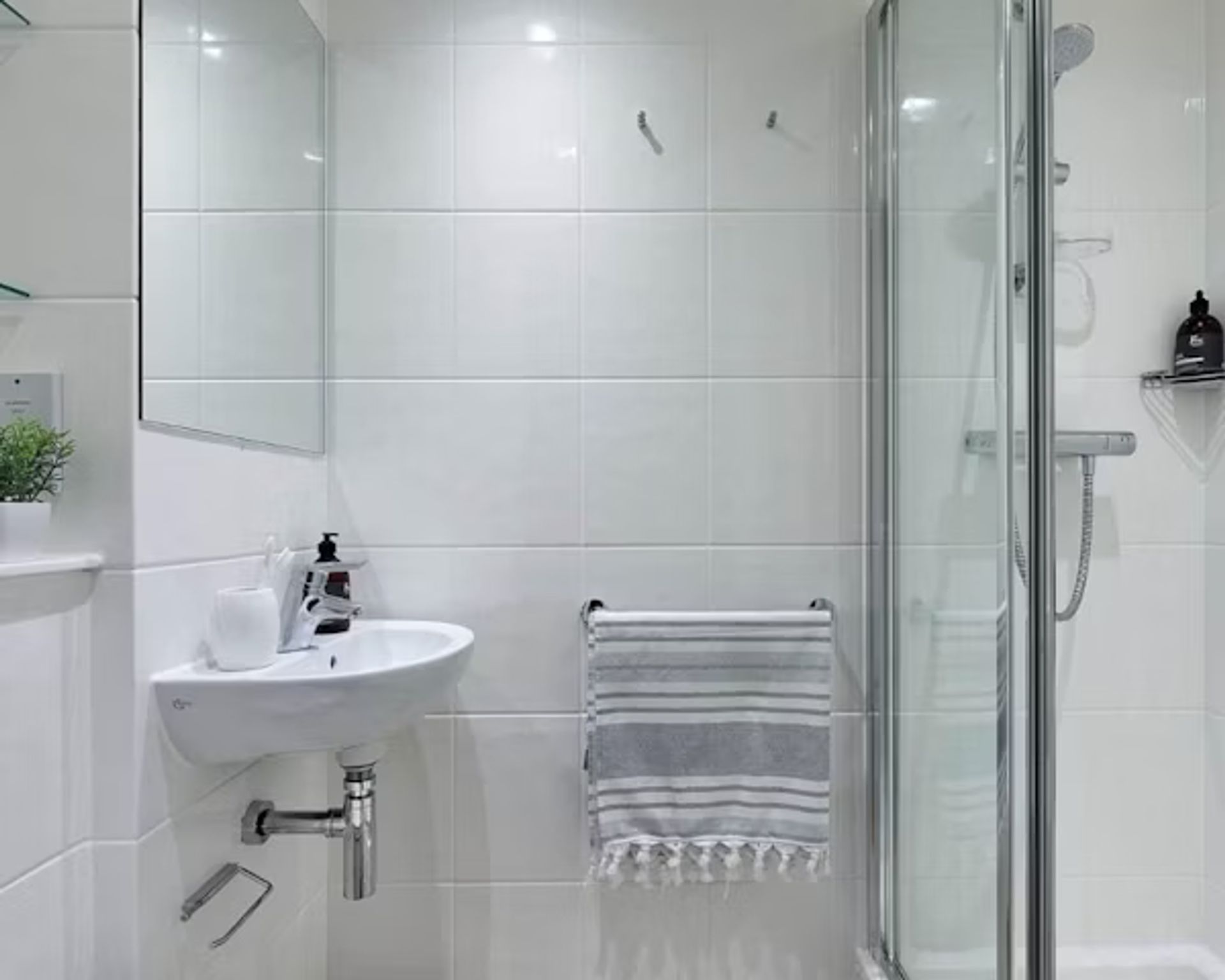 Our Premium Plus Enuite rooms are situated a little higher in the building and will ensure you have more privacy and more peace and quiet than in a regular booking, making them ideal for group bookings or for anyone in their third year who’s likely to be hitting the books hard. As a bonus, you’ll also have a lovely view of the Ocean City during your stay, at least when it’s dry! Offering everything you need for a great student experience. It has a 3/4 double bed, wardrobe, bedside shelf, coat hooks, and under-bed storage. The spacious desk, chair, bookshelves, and noticeboard make studying easy. Central heating keeps you cosy, and your private en-suite washroom adds convenience. You’ll also have access to a shared lounge with a sofa and TV.