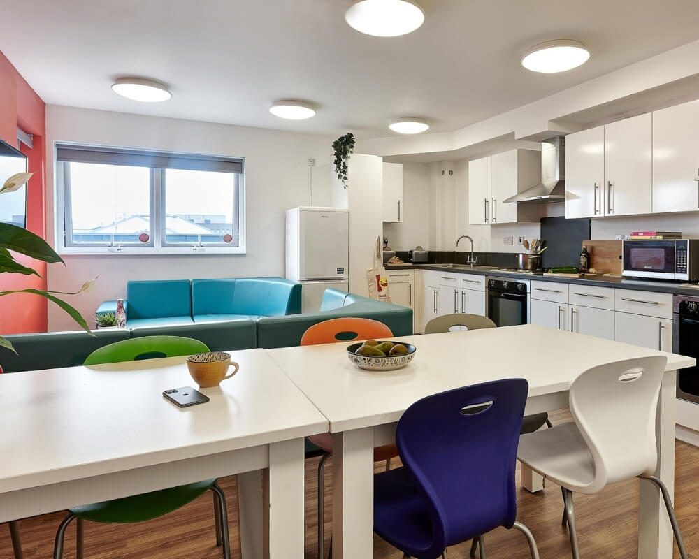 The Standard En-Suite room combines comfort with practicality, offering everything you need for a great student experience. It has a 3/4 double bed, wardrobe, bedside shelf, coat hooks, and under-bed storage. The spacious desk, chair, bookshelves, and noticeboard make studying easy. Central heating keeps you cosy, and your private en-suite washroom adds convenience. You’ll also have access to a shared lounge with a sofa and TV, and a well-equipped shared kitchen with essential appliances, along with a dining table and chairs.