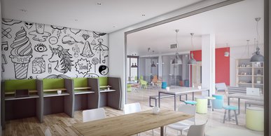 A large private studio measuring around 20.8 - 22.4 m² with a three quarter sized bed, ample storage, and a large study desk and chair. You will also have access to the communal dining area, amazing social spaces, outdoor areas and the on-site cinema.