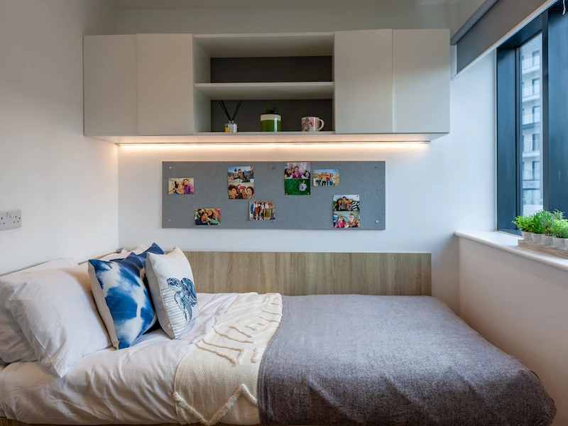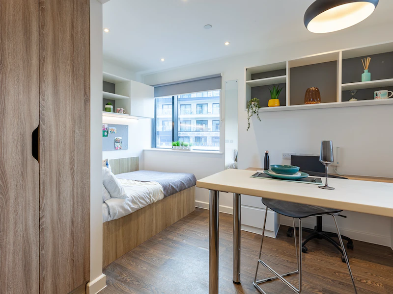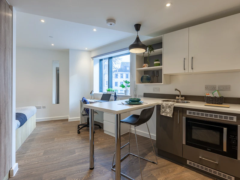 Our Premium Studio, available on all floors, measures a comfortable 19m² and is an uncompromising haven for students. You’ll have plenty of space for all your belongings, including ample under-bed storage. Relax in your comfortable 4ft bed after a long day of lectures, and bask in the luxury of your own private bathroom. Your contemporary kitchen space allows you to cook up a storm whenever hunger strikes. And when it’s time to focus on deadlines, your room is fully equipped with a desk and seating to make studying easier.