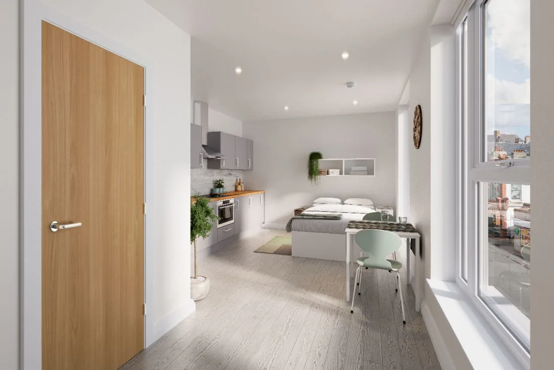 Room sizes may vary from 32.6 to 32.8m2 - Your own private studio - Private en-suite with shower - Double bed with under bed stor age - Over bed storage - Bedside tables - Wardrobe - Chest of drawers - Study desk with shelving - Desk chair - Notice board - Coat hooks - Mirror - Your own kitchen with plenty of storage - Double sofa - Dining table / breakfast bar with two seats - Under counter built in oven - 4 ring hob - Integrated fridge/freezer