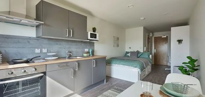 Room size of 28.4m2 - Your own private studio - Private en-suite with shower - Double bed with under bed storage - Over bed stora ge - Bedside table - Wardrobe - Chest of drawers - Study desk with shelving - Desk chair - Notice board - Coat hooks - Mirror - Your own kitchen with plenty of storage - Lounge chair / bean bag - Dining table / breakfast bar with two seats - Under counter built in oven - 4 ring hob - Integrated fridge/freezer