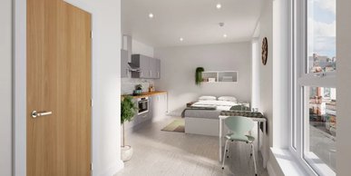 Room sizes may vary from 23.3 to 25.4m2 - Your own private studio - Private en-suite with shower - Double bed with under bed stor age - Over bed storage - Bedside table - Wardrobe - Chest of drawers - Study desk with shelving - Desk chair - Notice board - Coat hooks - Mirror - Your own kitchen with plenty of storage - Dining table / breakfast bar with two seats - Under counter built in oven - 4 ring hob - Integrated fridge/freezer - Integrated fridge/freezer