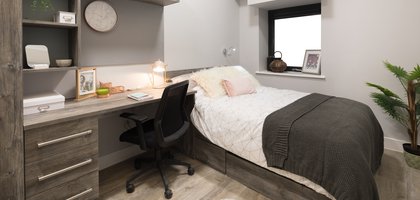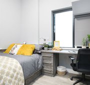 What's included: 3/4 size double bed with underbed storage Private en-suite shower room Private kitchen with 2 ring hob, combi microwave oven and fridge/freezer Breakfast bar and chair Study desk and desk chair Double wardrobe Drawers Plenty of storage space Dining space Private front door