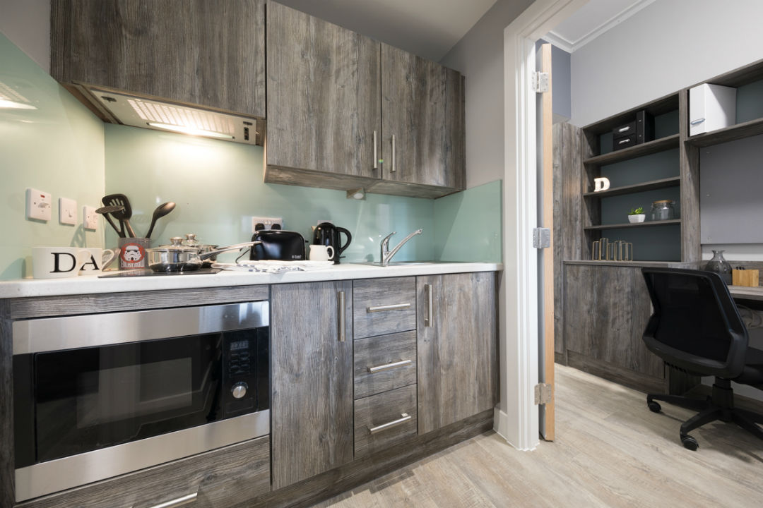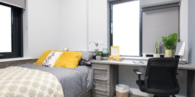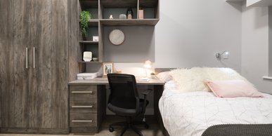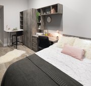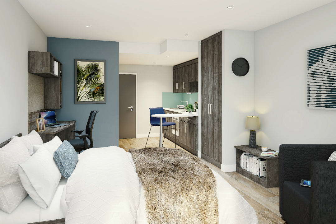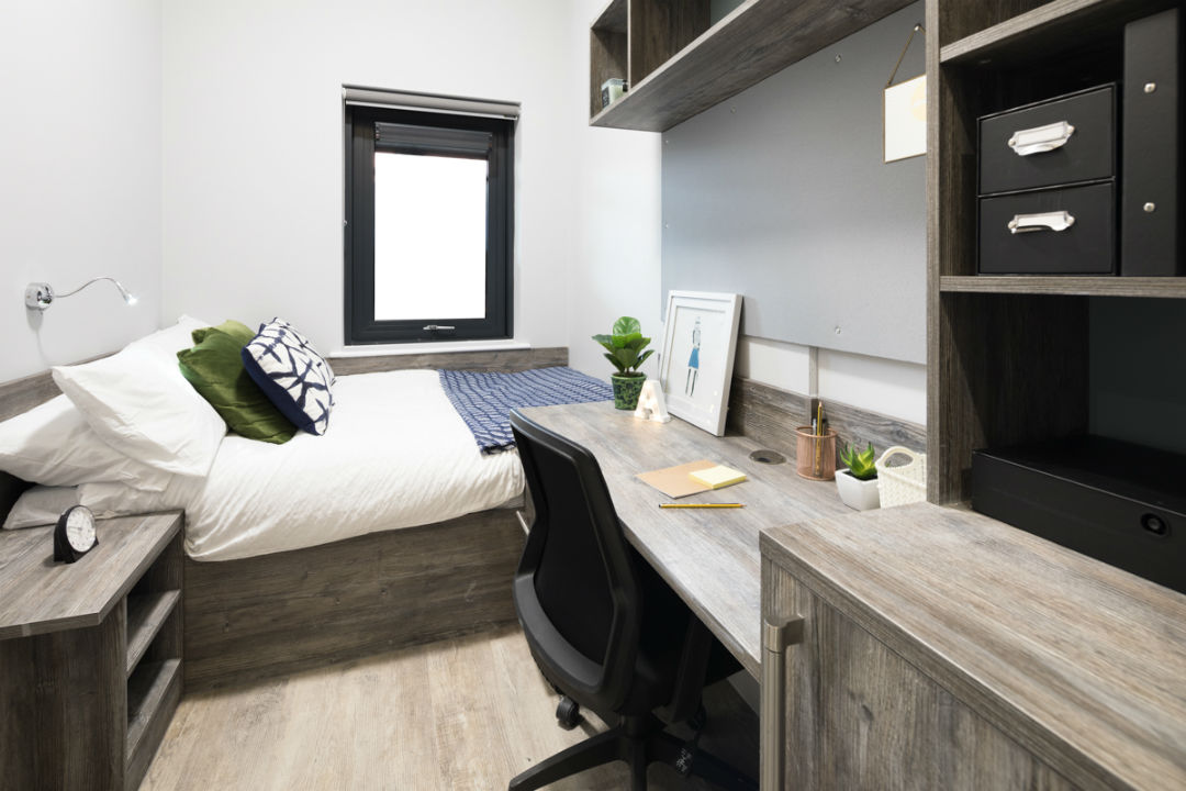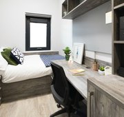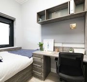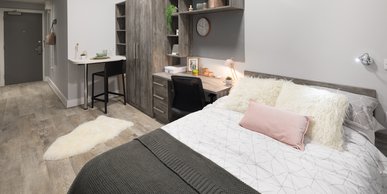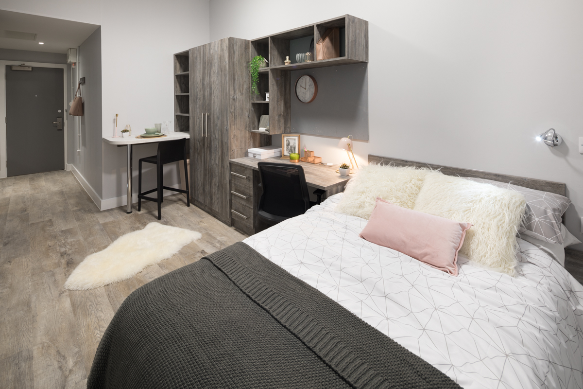 What's included: 3/4 size double bed with underbed storage Private en-suite shower room Private kitchen with 2 ring hob, combi microwave oven and fridge/freezer Breakfast bar and chair Study desk and desk chair Double wardrobe Drawers Plenty of storage space Dining space Private front door