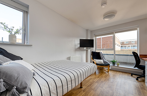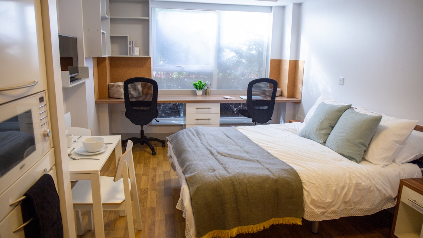 What's included : Ensuite bedroom (18-20m2) in a connecting studio Small Double Bed Wardrobe Desk Chair Fridge with small Freezer compartment Integrated Microwave Oven Television Shelving Unit Electric Hob Dining Area Single Soft Chair Shared Kitchen Ensuite Bathroom