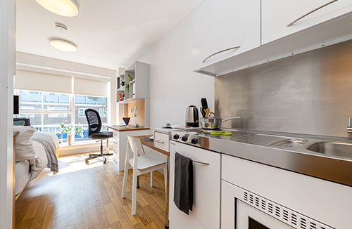 What's included : Private studio apartment (16-17m2) Small Double Bed Wardrobe Desk Chair Fridge with small Freezer compartment Integrated Microwave Oven Television Shelving Unit Electric Hob Dining Area Single Soft Chair Ensuite Bathroom