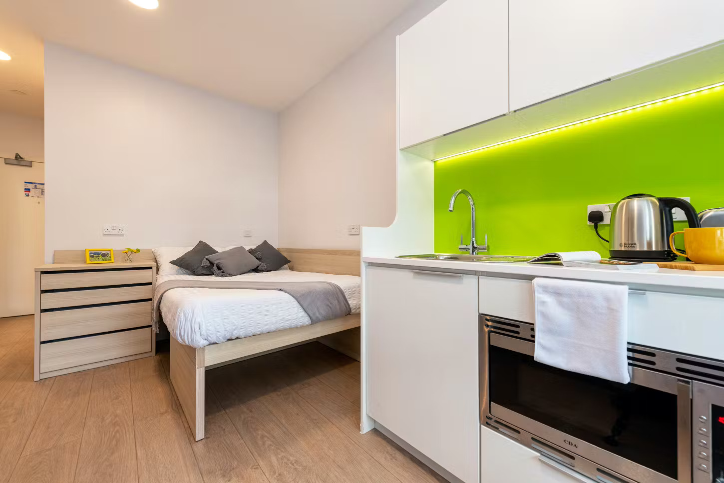 What's included : Corner private student apartment (18.7m2) Small Double Bed Wardrobe Desk Chair Fridge with small Freezer compartment Integrated Microwave Oven Television Shelving Unit Electric Hob Dining Area Sofa Ensuite Bathroom