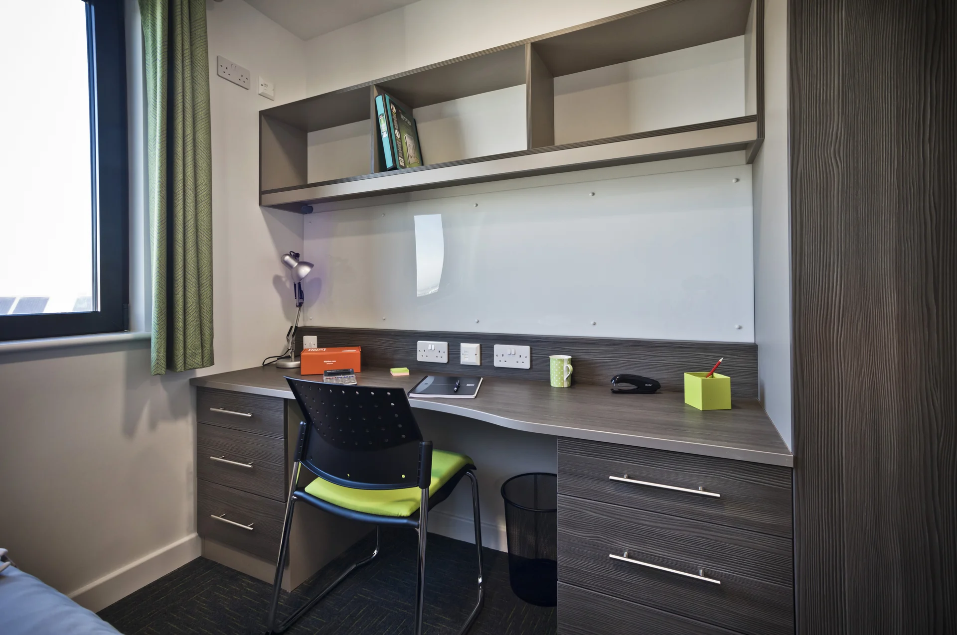 Friargate Court Preston is a Preston student accommodation that offers en-suite rooms within shared apartments and private studios. En-suite rooms vary in size and feature a queen-sized bed, a full-length mirror, fitted storage, a wardrobe, a study area with a desk and chair, and an en-suite bathroom. As for the apartments, they have a shared living area and a kitchen.