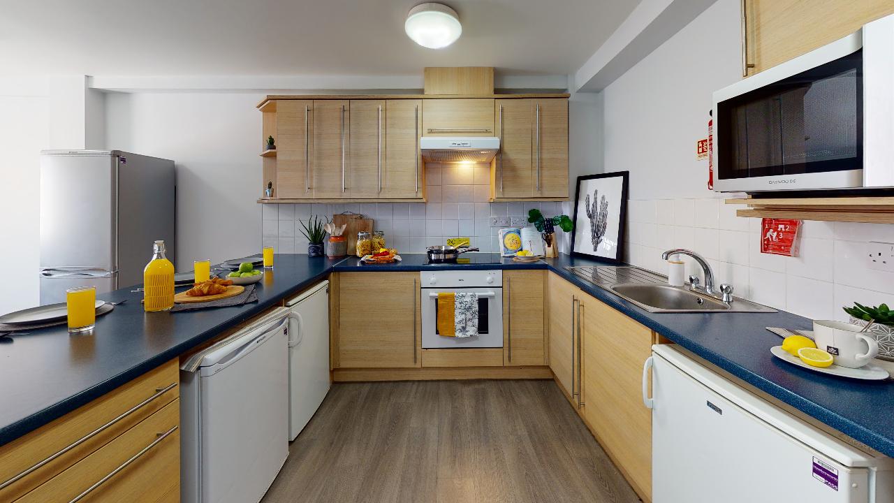 With all the features of our Bronze En Suite rooms, these upgraded rooms have the bonus of being refurbished in modern style with hardwood floors. In addition to your private room with bathroom, study area, storage and small double bed, you’ll share a large open-plan kitchen and living space with your flatmates. With all the essential cooking equipment, a breakfast bar and sofas, it’s well equipped. The building also has its own laundry and onsite shop.