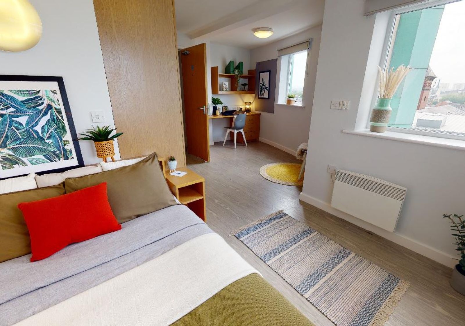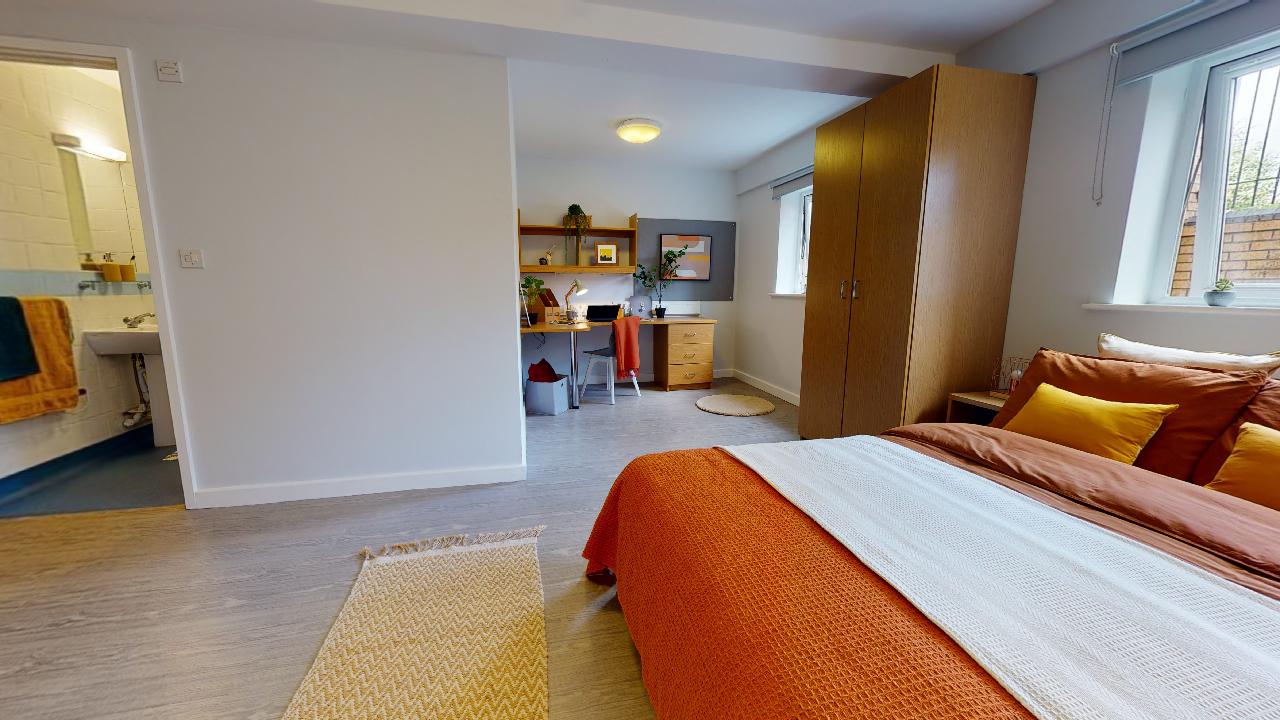These enormous ground floor rooms are a big upgrade, with full-size double bed, lots of floor space, plenty of storage and private bathroom. Your room also comes with study area and modern styling throughout, with plenty of room to manoeuvre. Along with the privacy it gives you, you’ll also get the social benefits of a shared open-plan kitchen and living space with all the essential cooking equipment, a breakfast bar and sofas. The building also has its own laundry and onsite shop.