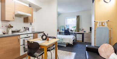 Our Studio room style comes fully furnished to the highest standards with a comfy bed with over-bed lighting and underbed storage to keep your belongings tidied away. You’ll also have your own en-suite bathroom for those late night showers, a study space for completing your university work and a living area with a sofa for unwinding after a busy day. Wanting to cook up something tasty for dinner? Your kitchen area has all the amenities you could need including a fridge/freezer, microwave, 4 ring hob, oven and grill and dining table with chairs.