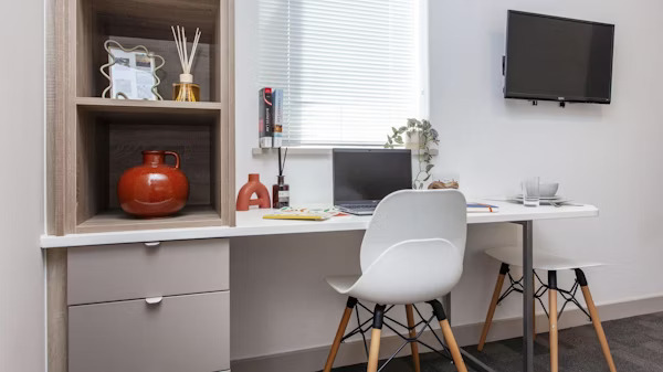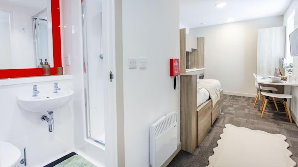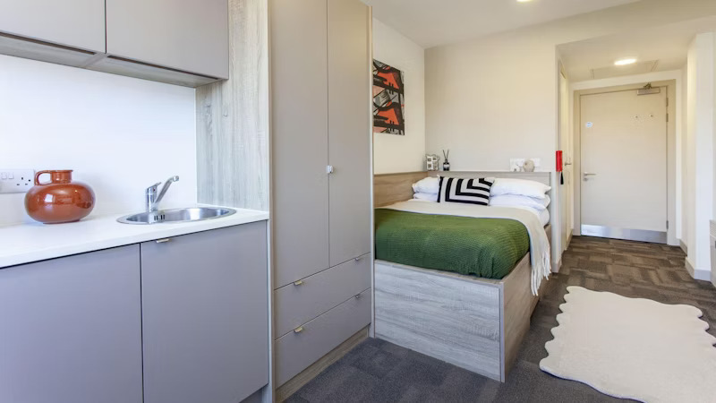 The Studio Apartment offers a well-designed layout with a king-size bed for extra comfort, a private ensuite bathroom, and a kitchen fitted with a 4-ring hob, combination microwave, and fridge with freezer compartment. There’s plenty of space to study with a large desk and chair, while the 32″ flat screen TV provides an easy way to relax after a long day. A full-length mirror, noticeboard, and built-in wardrobe help keep your room tidy and personal to you.