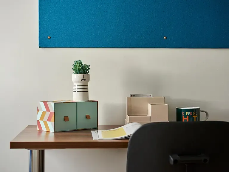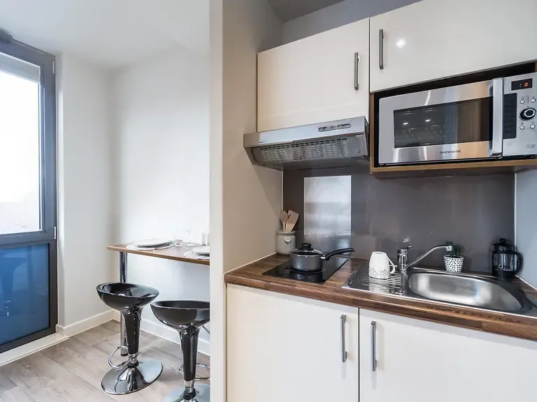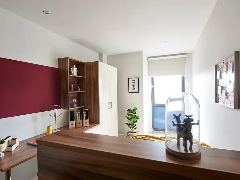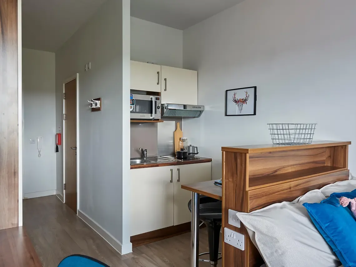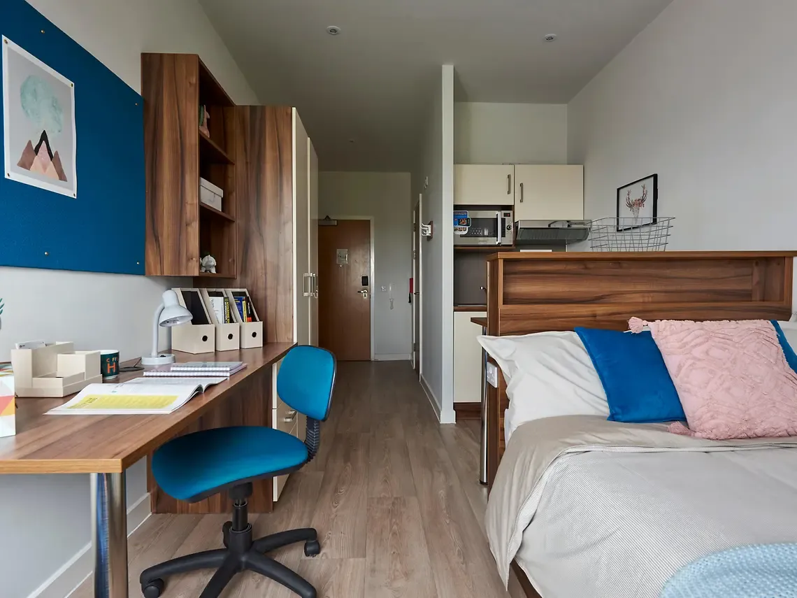 What's in the room? - Breakfast bar - Double bed with under bed storage - Drawers - Plenty of storage - Private en-suite shower room - Private kitchen with ceramic hob, combi oven, and fridge freezer - Shelves - Stools - Study space with desk and chair - Wardrobe